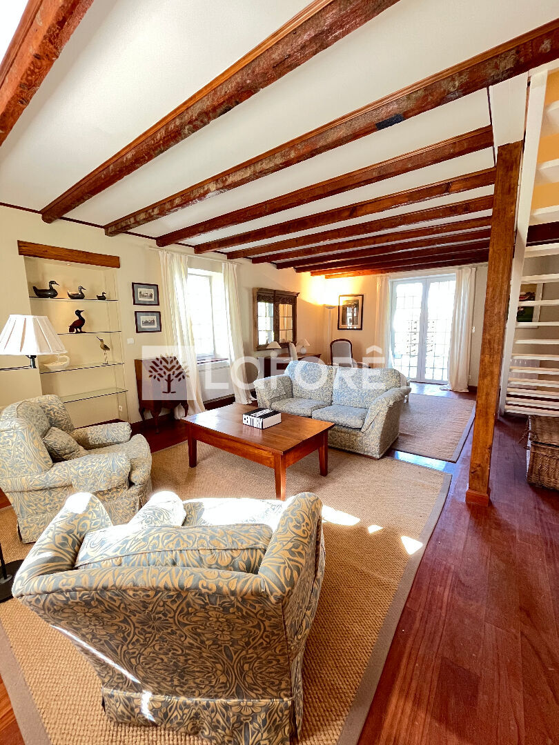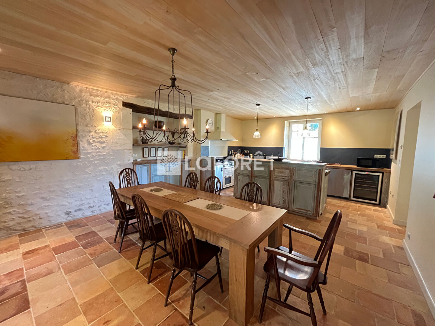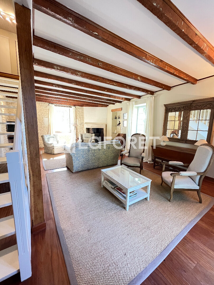 Celle-ci se compose au rez-de-chaussée, d'une entrée donnant sur une salle d'eau avec WC, d'un chaleureux double séjour avec une cheminée, d'une spacieuse cuisine ouverte et toute équipée (piano de cuisson mixte, hotte, lave vaisselle, frigos, congélateurs, cave à vin) , ainsi que d'un cellier/buanderie.