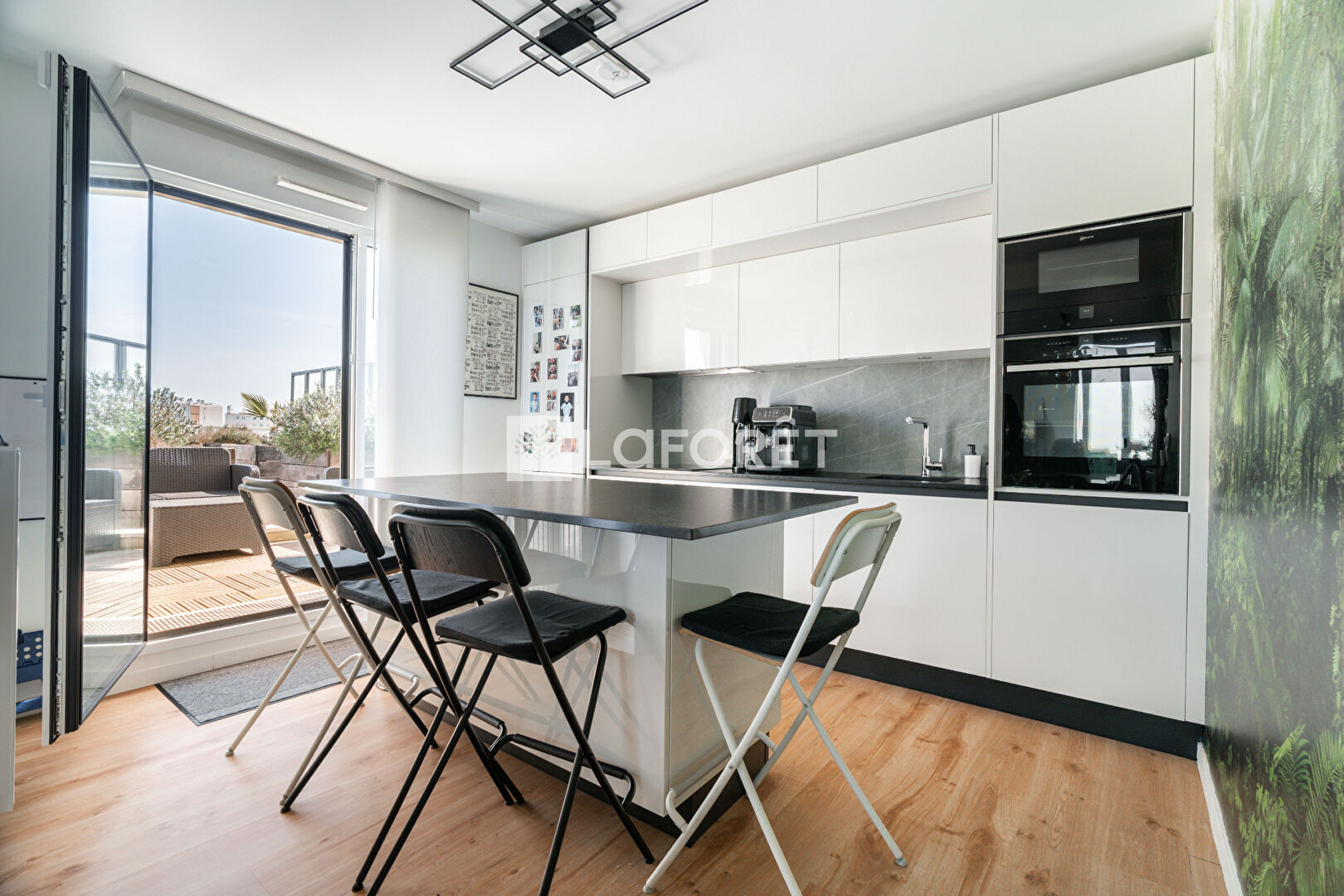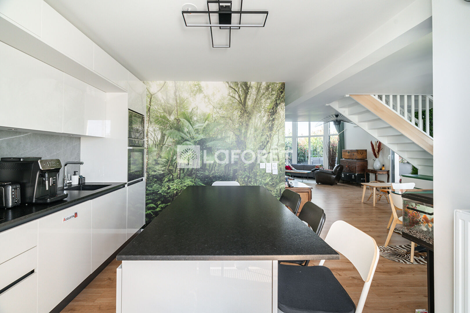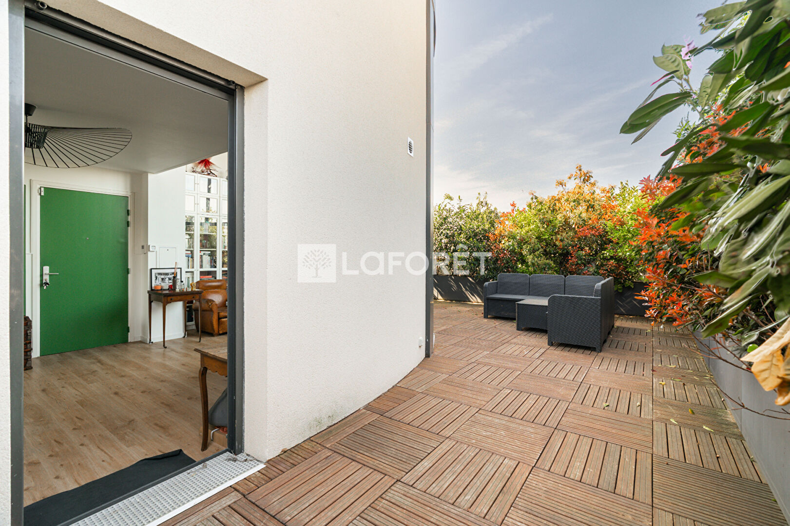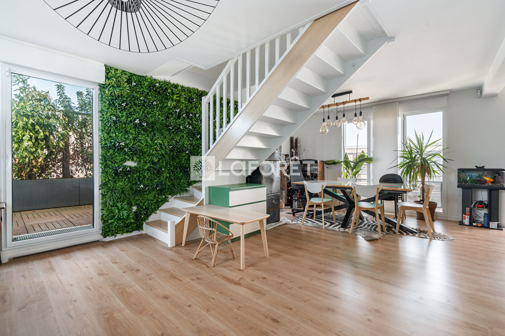 Dès l'entrée, vous êtes accueilli par une grande pièce de vie traversante de 55m² avec séjour, salle à manger et cuisine ouverte, aménagée et équipée. Le séjour bénéficie d'une belle hauteur sous plafond de plus de 5m et de grandes baies vitrées donnant accès à une première terrasse végétalisée de 46 m², sans vis-à-vis. Une seconde terrasse, accessible depuis la cuisine, permet de profiter d'un espace extérieur supplémentaire. Un cellier et un WC complètent ce niveau.