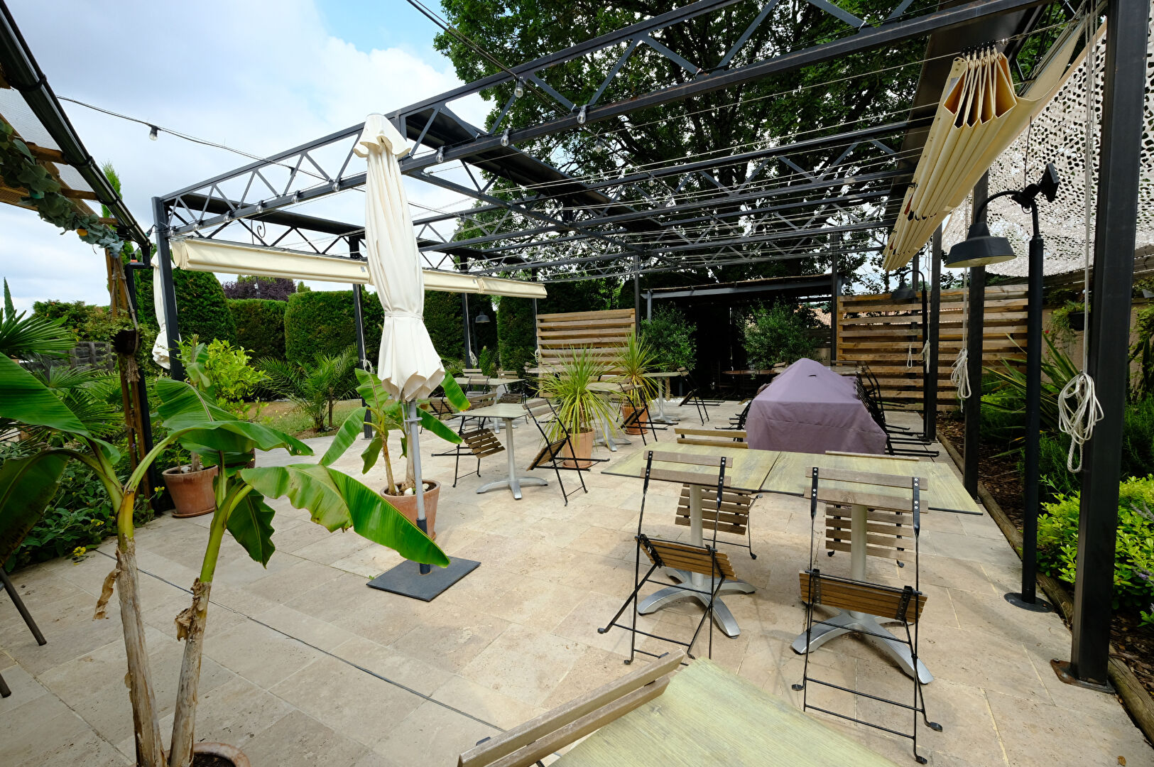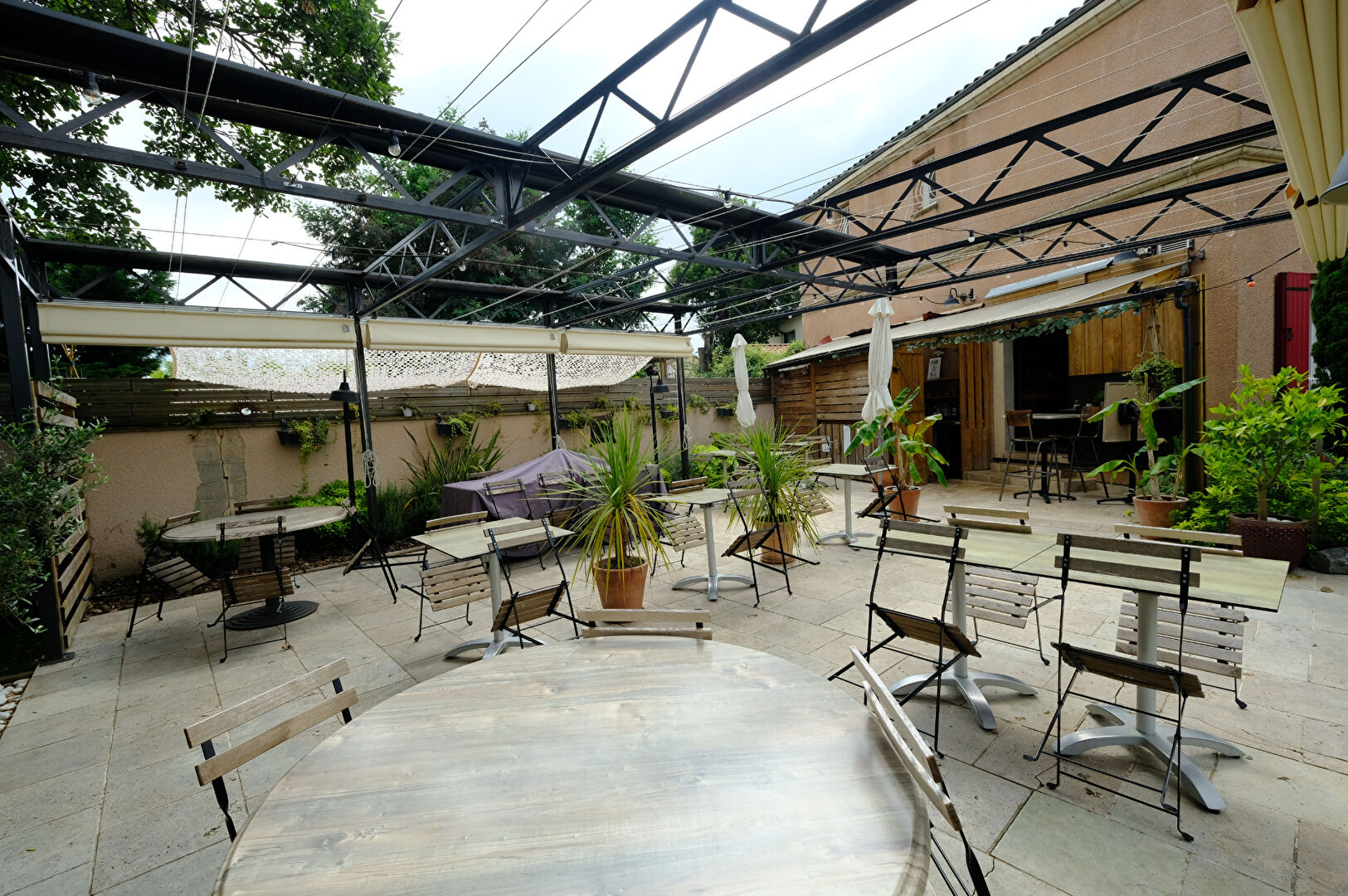 Le local restaurant de 96 m² offre une très belle salle principale chaleureuse et accueillante d'environ 56 m², une grande cuisine professionnelle 34 m² avec plonge, espace sanitaire aux normes handicapées pour les clients. À l'extérieur, un bar et une large terrasse surmontée d'une pergola haut de gamme offre aux beaux jours un espace extérieur convivial pouvant accueillir une quarantaine de personnes.