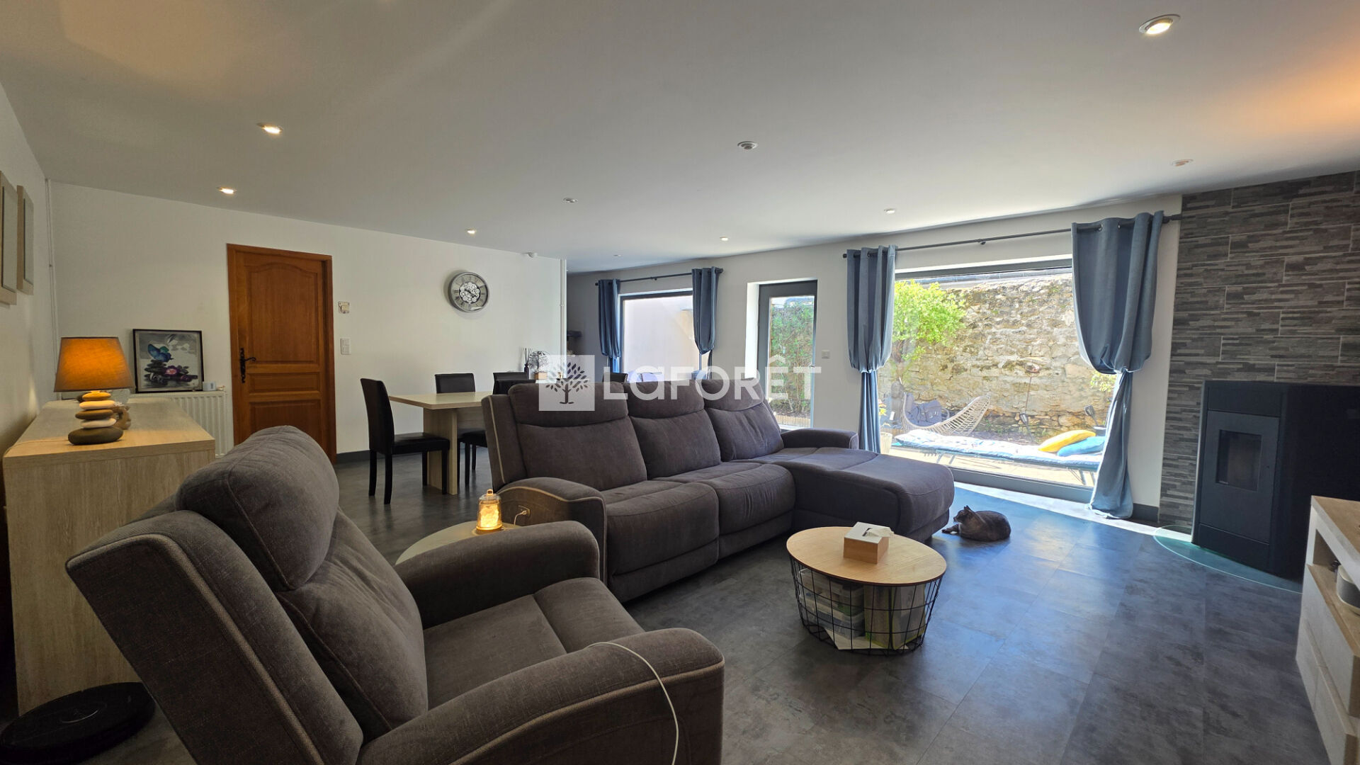 Dès l'entrée, vous serez accueillis par un couloir avec penderie menant à une cuisine aménagée et équipée, ainsi qu'à un vaste séjour-salon d'environ 40 m². Cet espace de vie lumineux, agrémenté d'un poêle à pellets récent (2025), s'ouvre directement sur la cour, créant une belle continuité entre intérieur et extérieur. Une laverie et un WC complètent le rez-de-chaussée.