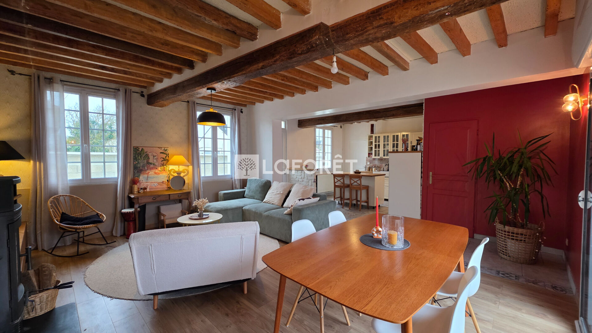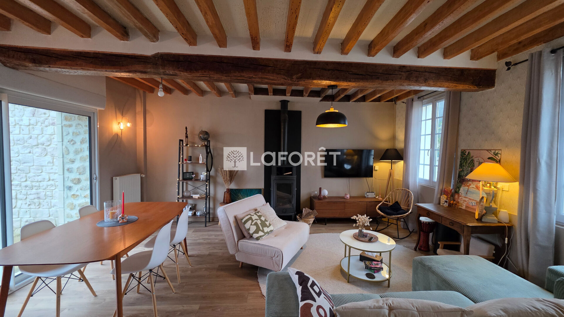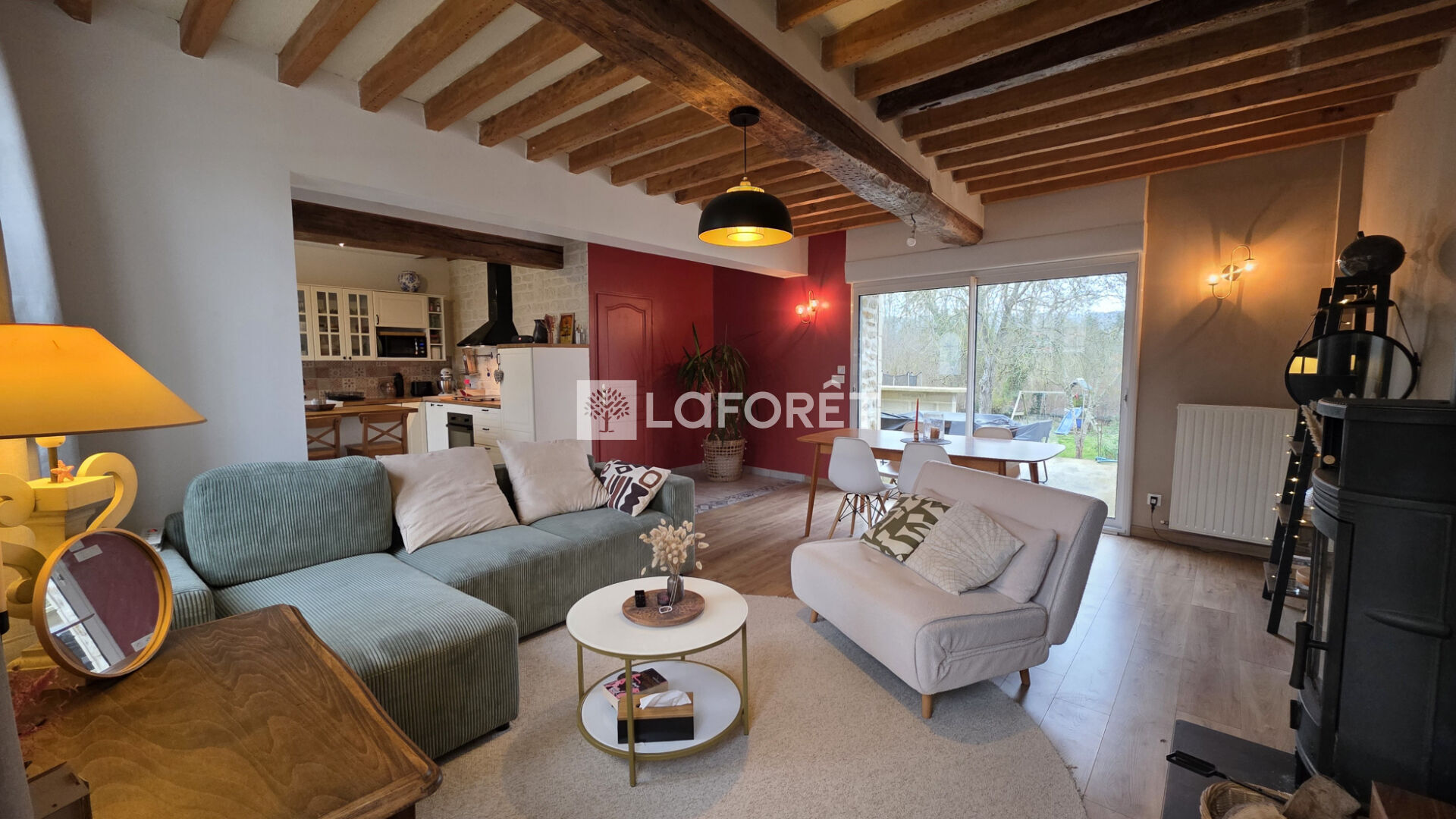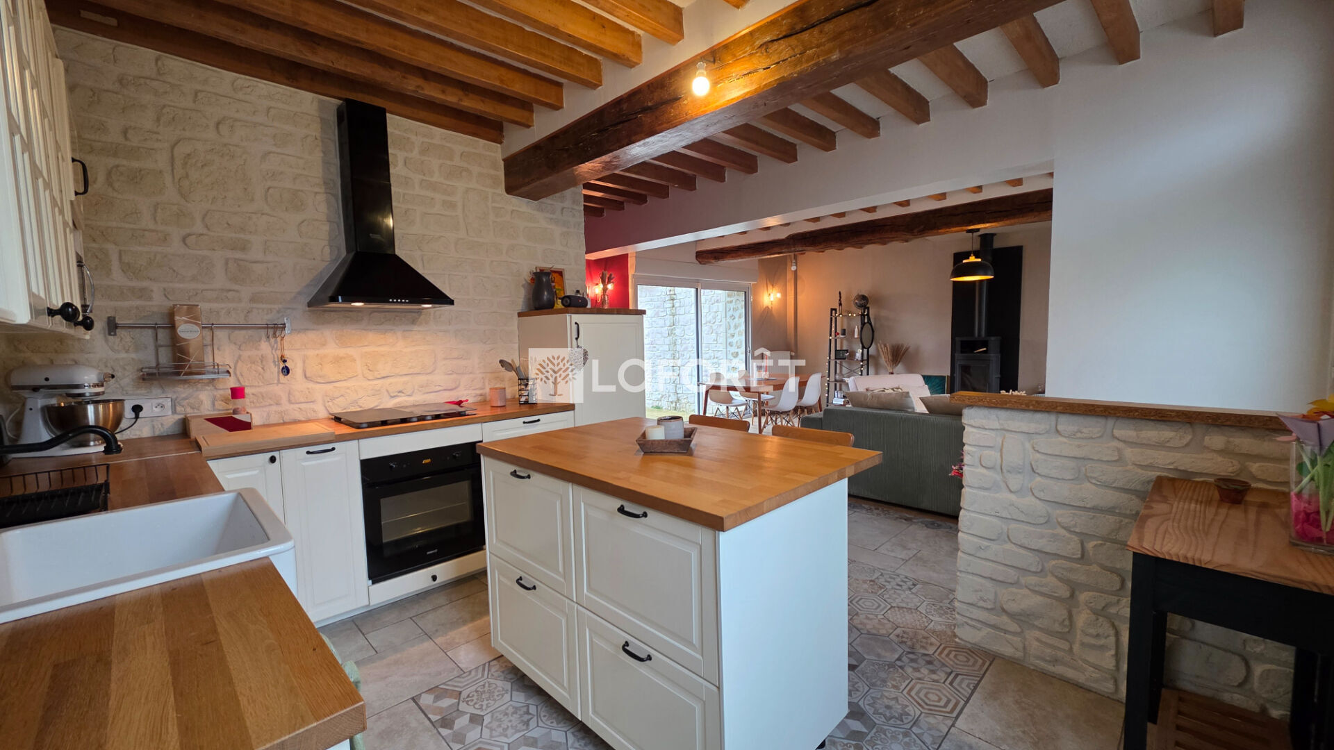 Rez-de-chaussée, entrée ouverte sur séjour lumineux avec cuisine américaine aménagée et équipée, un poêle à bois avec conduit tubé agrémente cet espace.