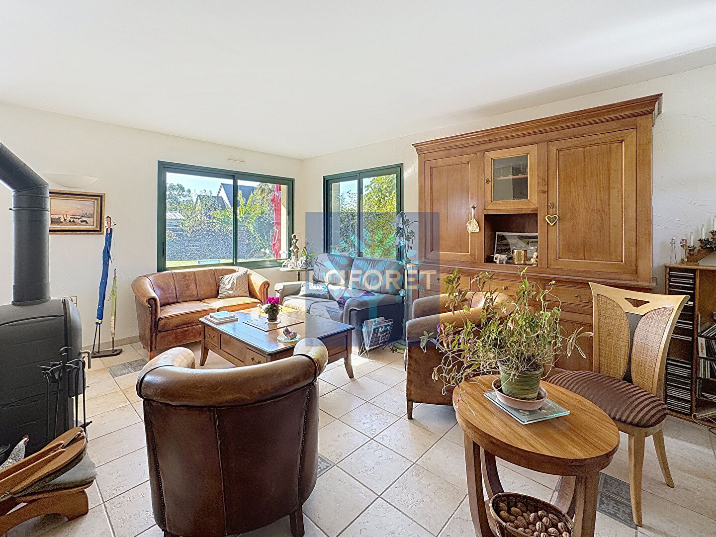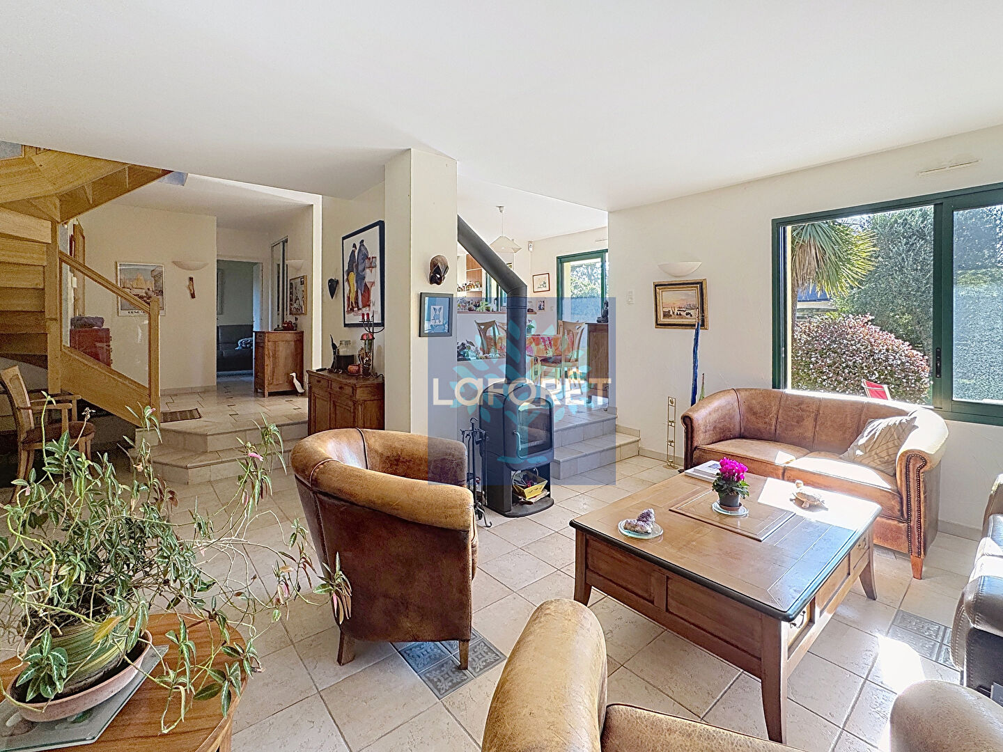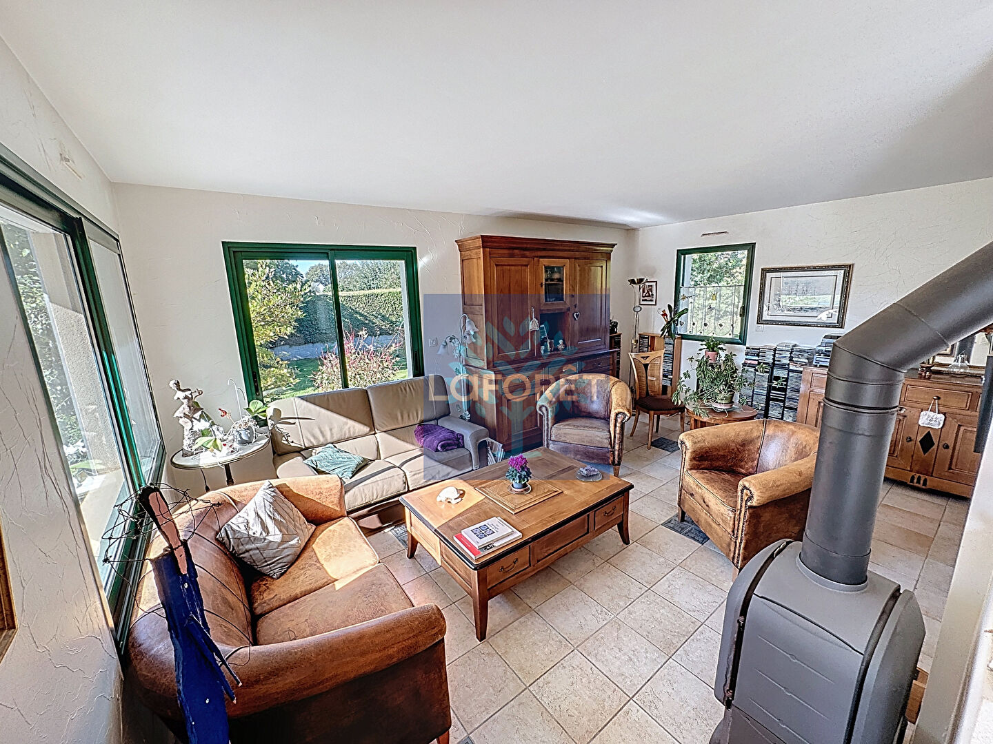 - au rez-de-chaussée : une entrée avec placard, une cuisine aménagée et équipée ouverte sur un très bel espace à vivre (salon-séjour de 40 m² env avec poêle à bois donnant sur 1 terrasse expo Sud /Ouest), une chambre, wc indépendant et buanderie.