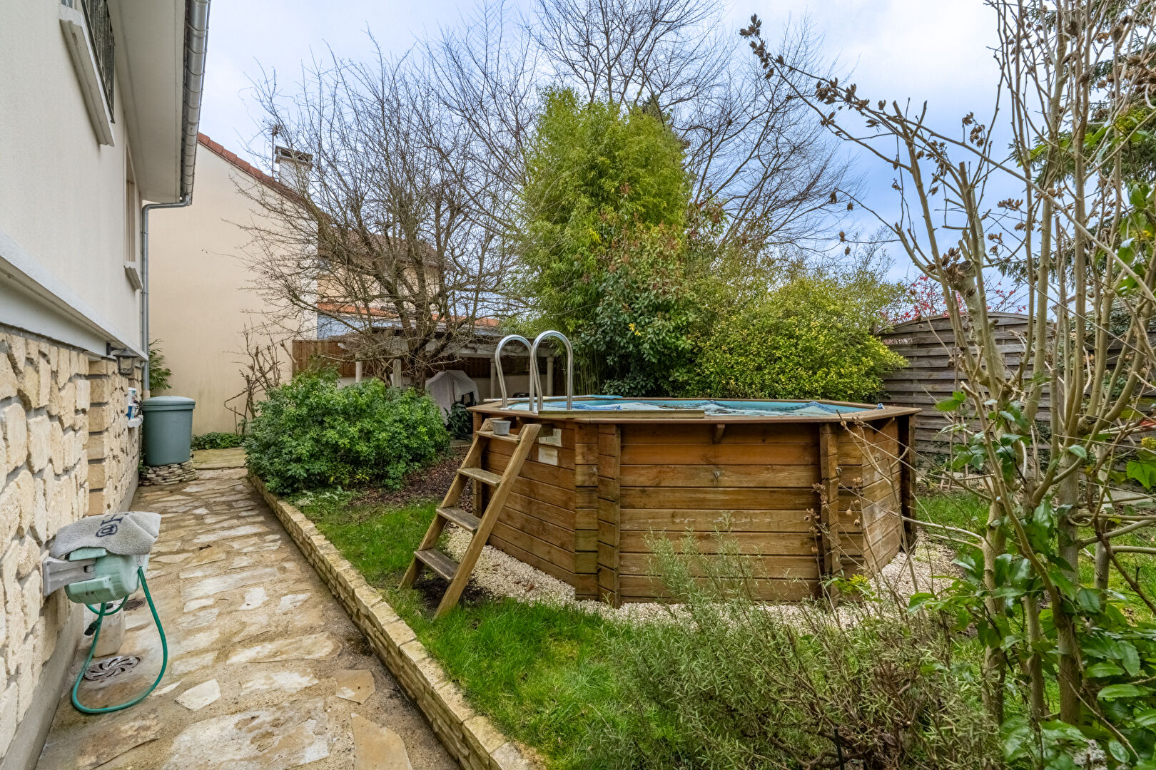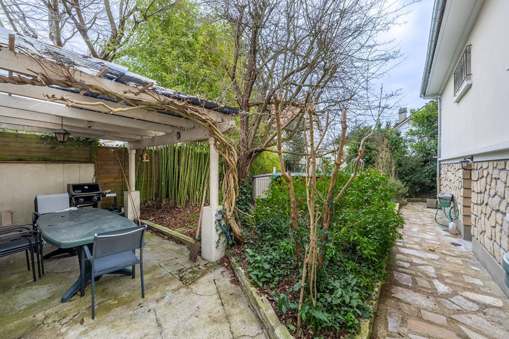 Le jardin paysagé est un véritable havre de paix avec sa piscine privée et sa pergola pour des moments de détente inoubliables.