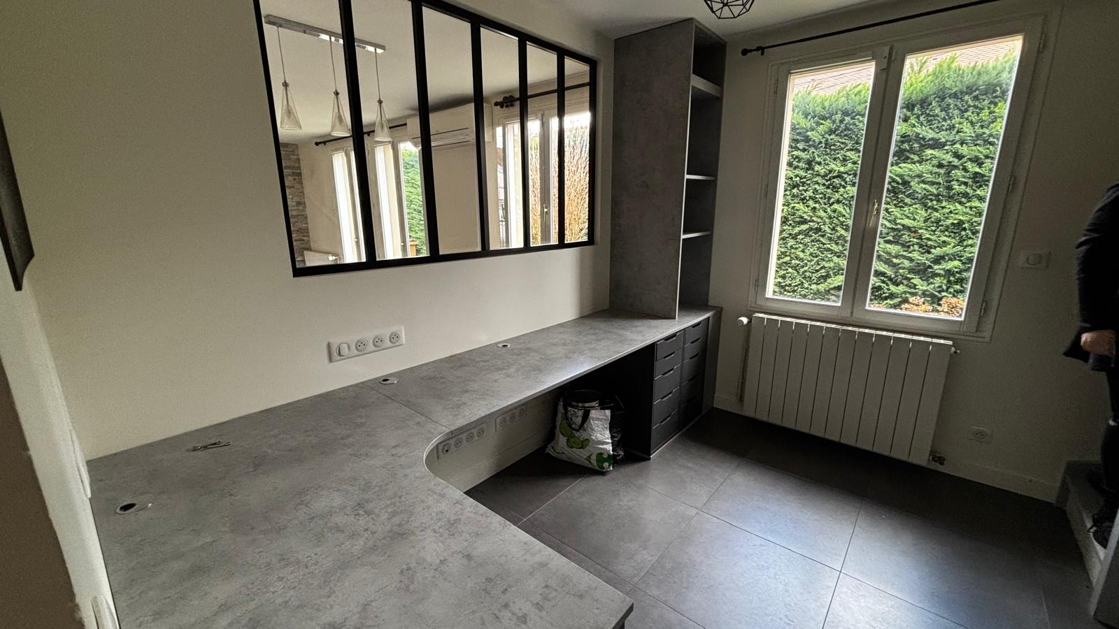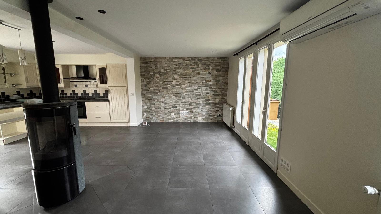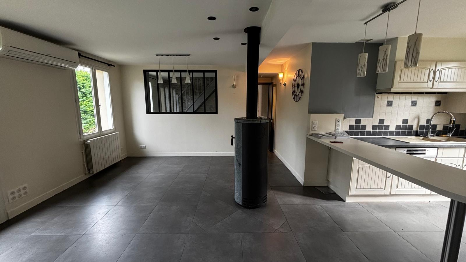 Elle offre une belle entrée avec bureau verrière idéal pour le télétravail, ainsi qu'un double séjour chaleureux avec poêle à bois et une cuisine ouverte aménagée et équipée.