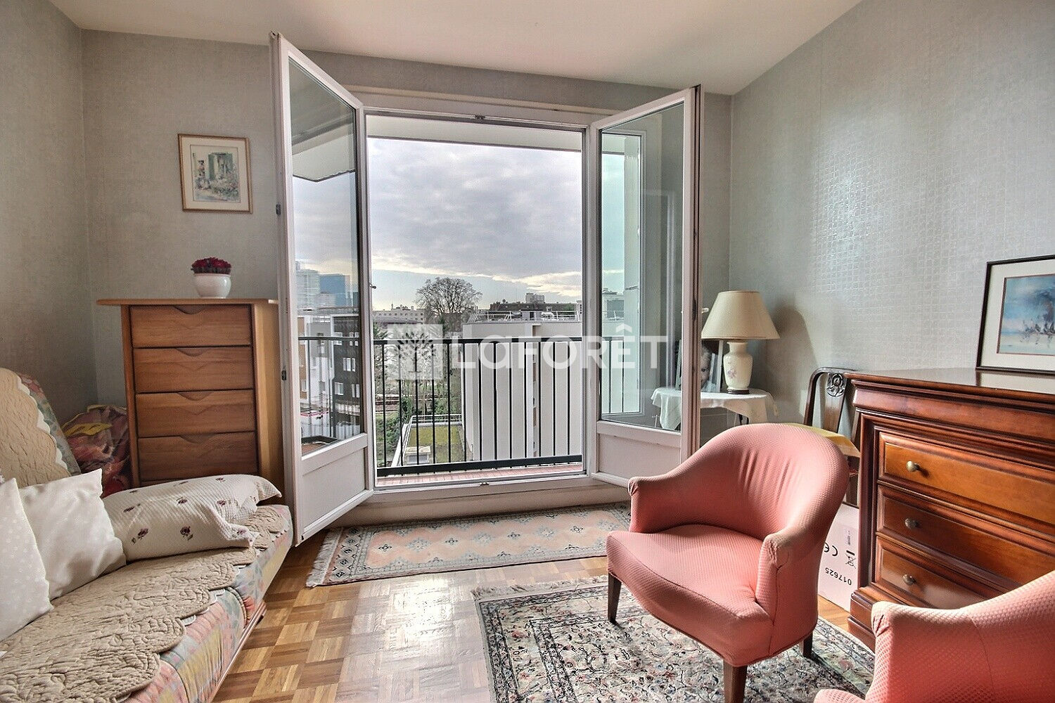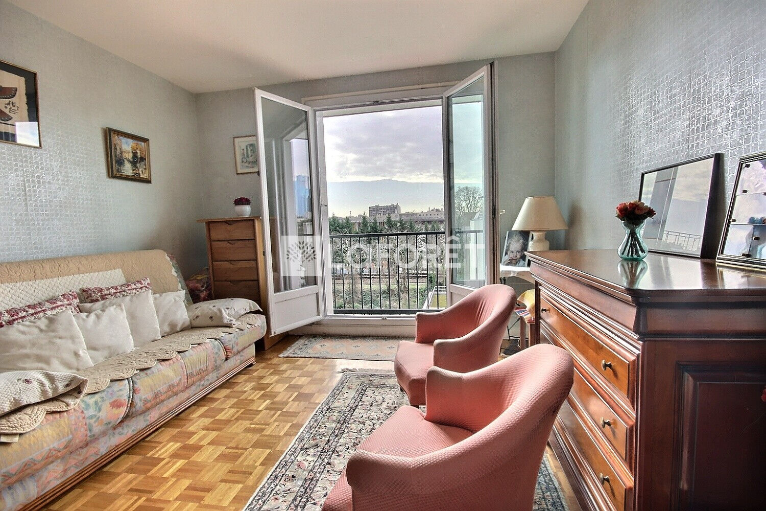 entrée, séjour sur jardins orienté sud-est, 2 chambres dont une ouvrant sur BALCON EXPOSÉ SUD-EST, cuisine dînatoire, salle de bains et WC séparés.