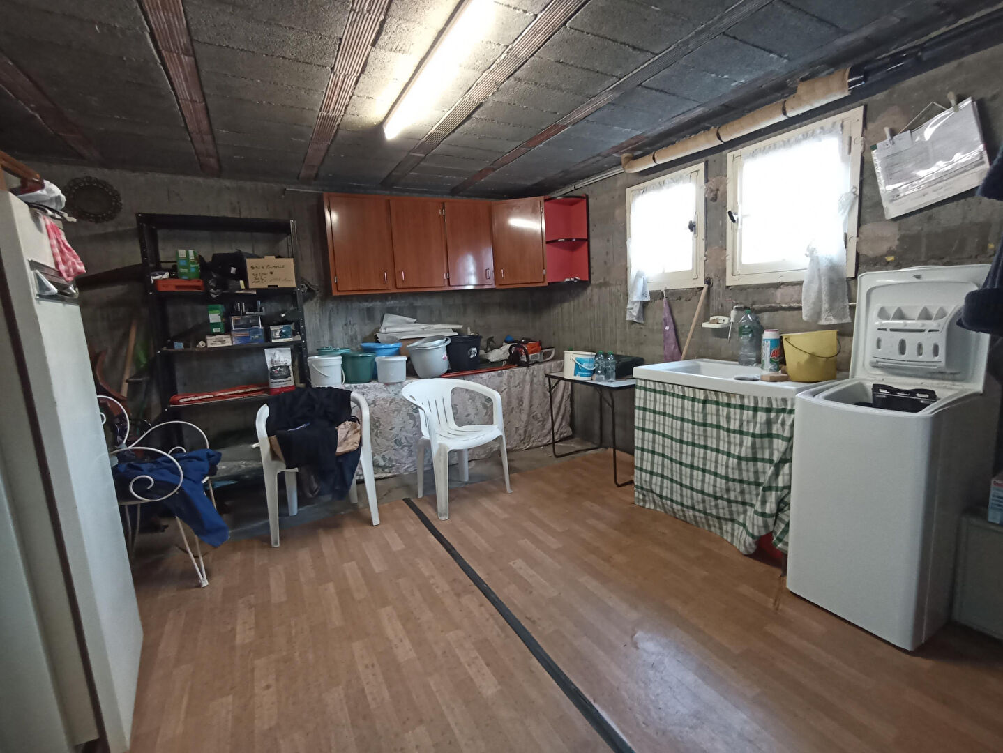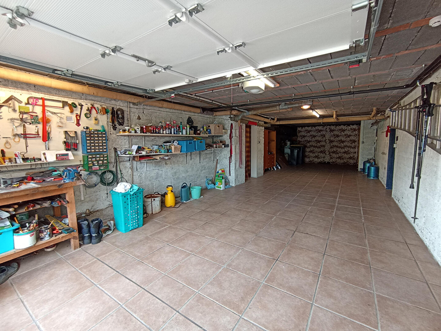 En sous-sol, vous trouverez un grand garage carrelé de 56 m², espace chaufferie, buanderie et cave.