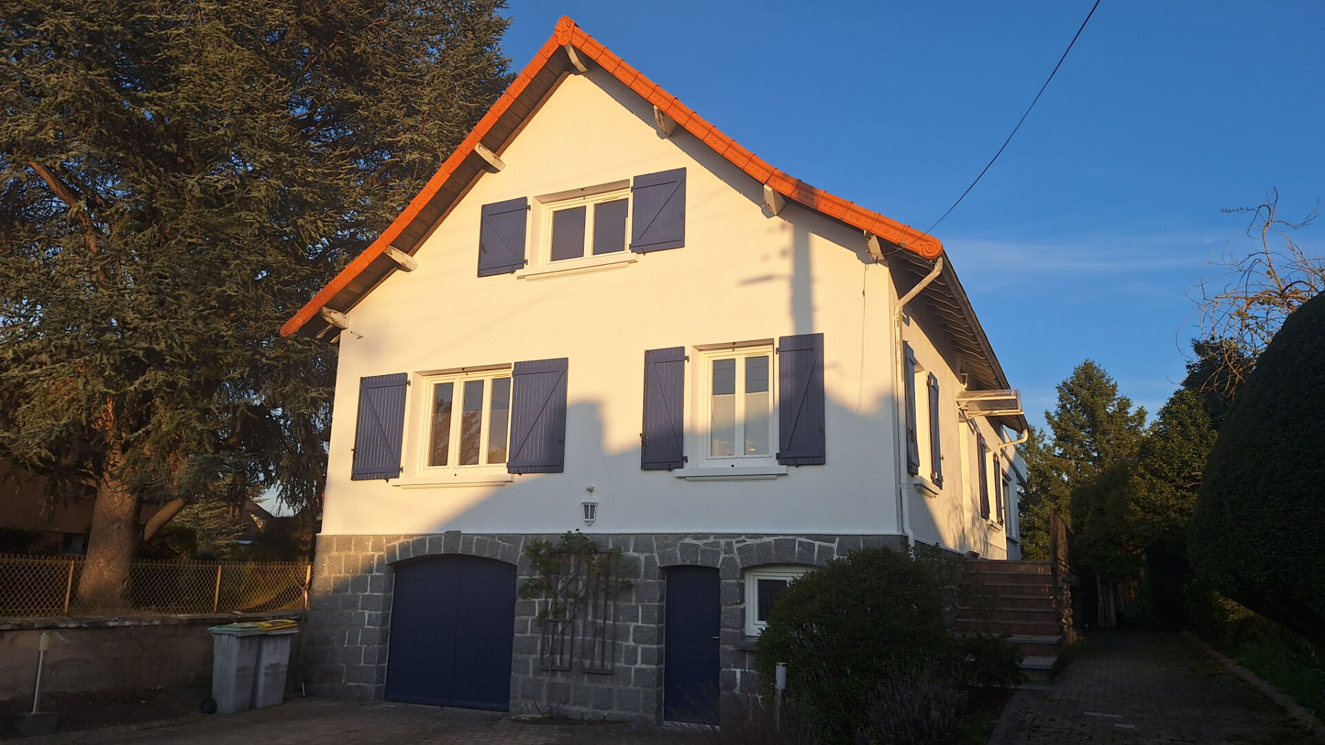 Côté prestations : chauffage par pompe à chaleur air/eau couplé à une chaudière fuel pour l'eau chaude sanitaire. Huisseries en PVC double vitrage, volets bois + PVC roulants, assainissement collectif conforme.