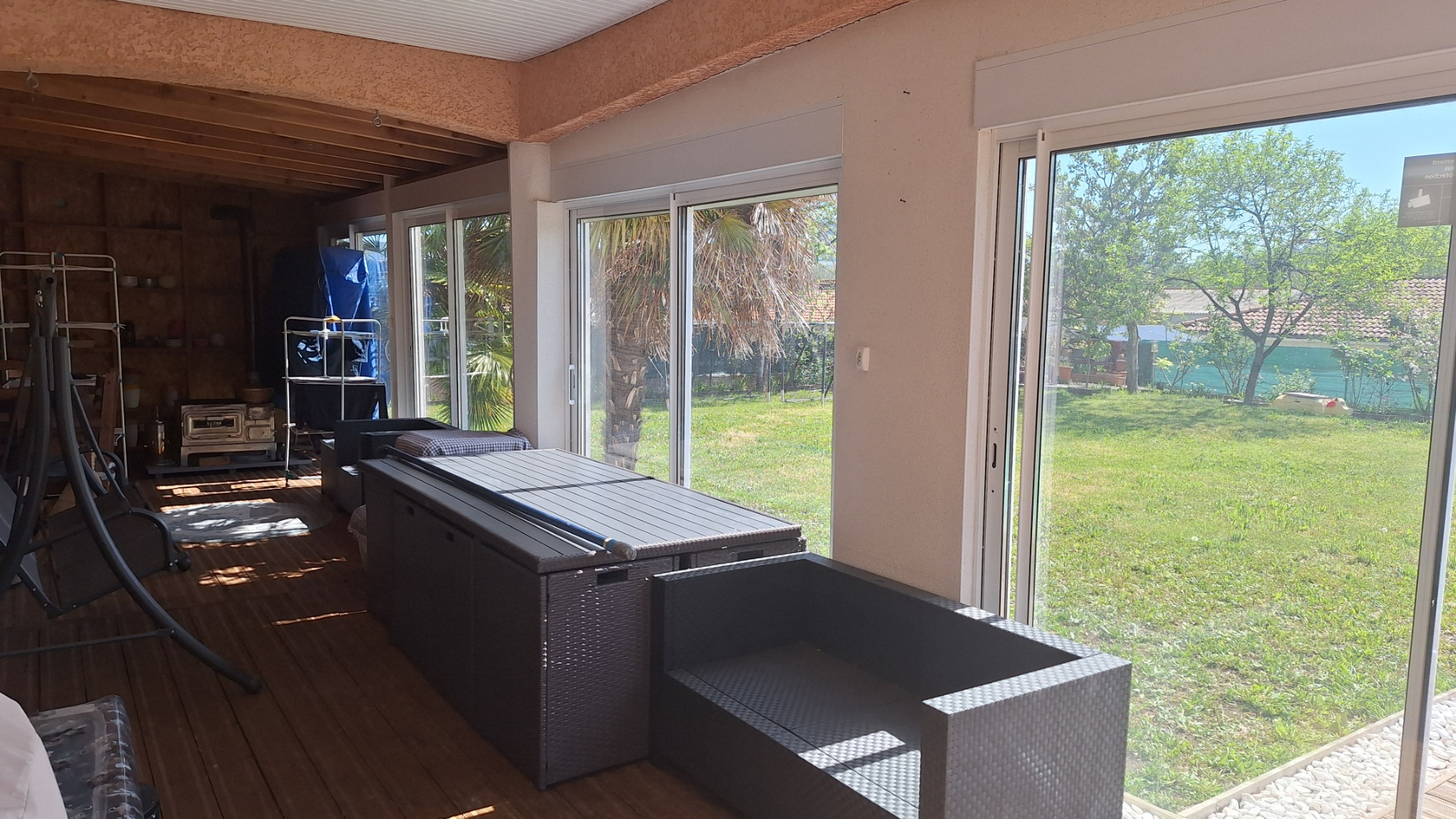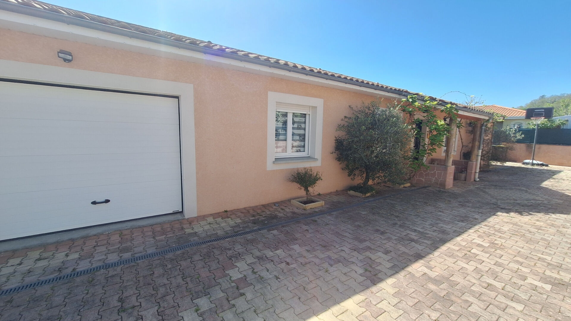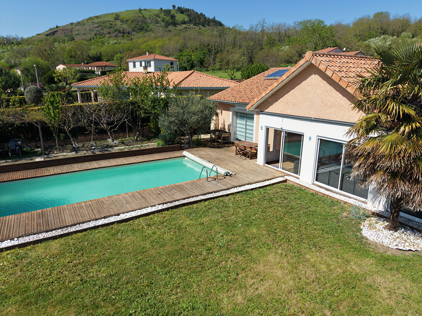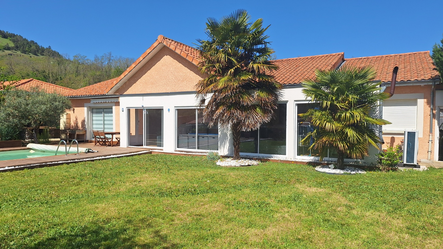 Au niveau des prestations : chauffage au sol par pompe à chaleur, menuiseries en PVC at aluminium double vitrage, volets roulants électriques et panneaux solaires alimentant l'eau chaude sanitaire.