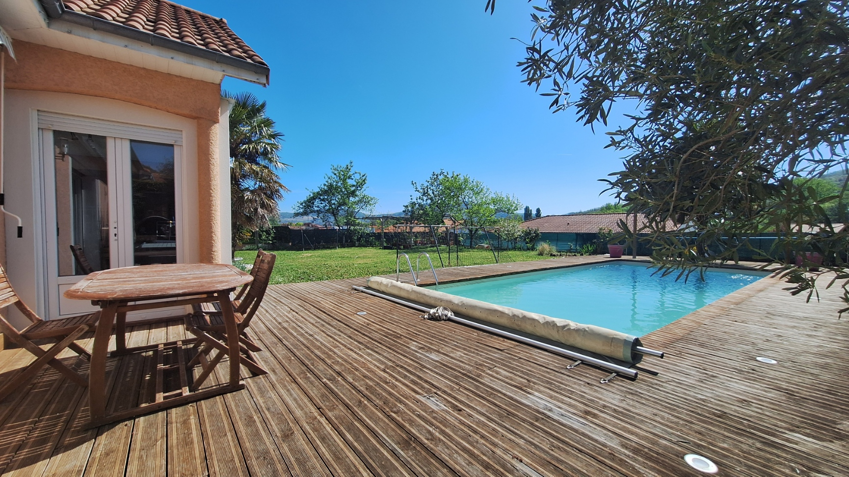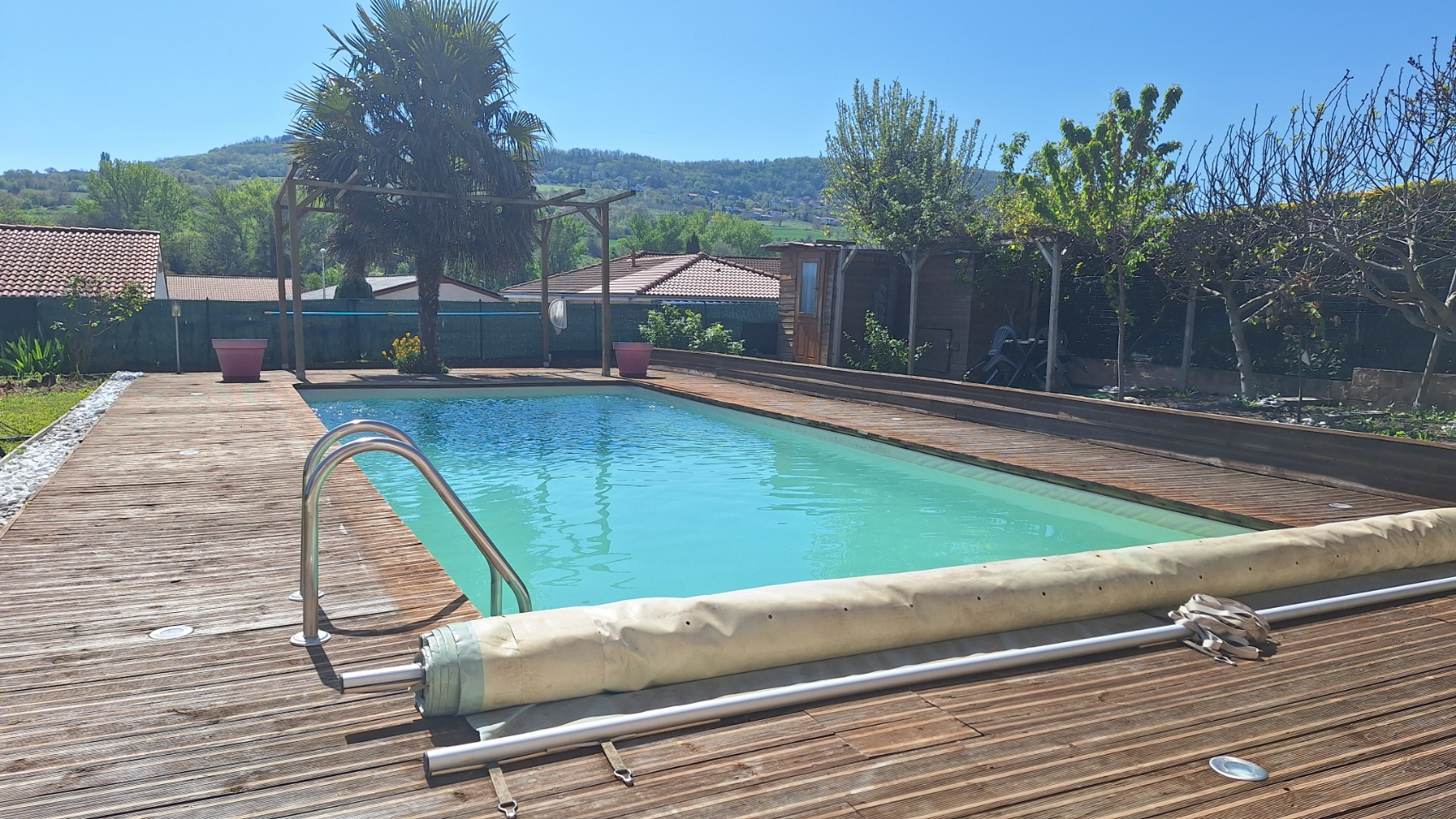 Piscine 4x10 chauffée avec une PAC, avec liner, traitement au chlore et bâche à barres comme système de sécurité.