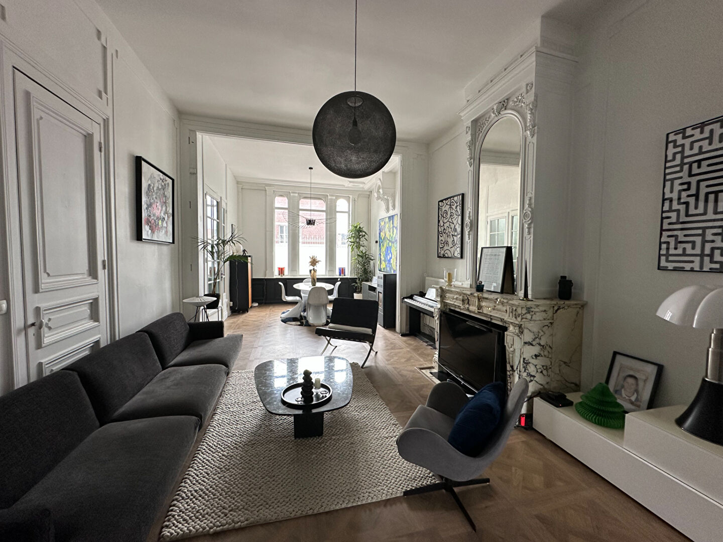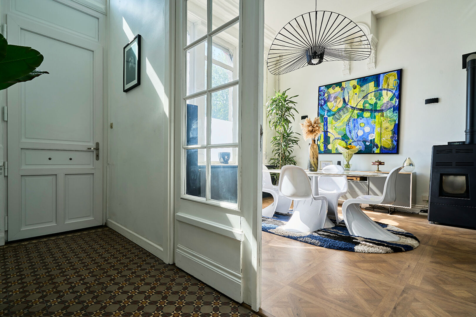 Le salon et la salle à manger communiquent harmonieusement, offrant une belle hauteur sous plafond, des moulures d'époque, une cheminée en marbre et de larges fenêtres laissant entrer la lumière naturelle.