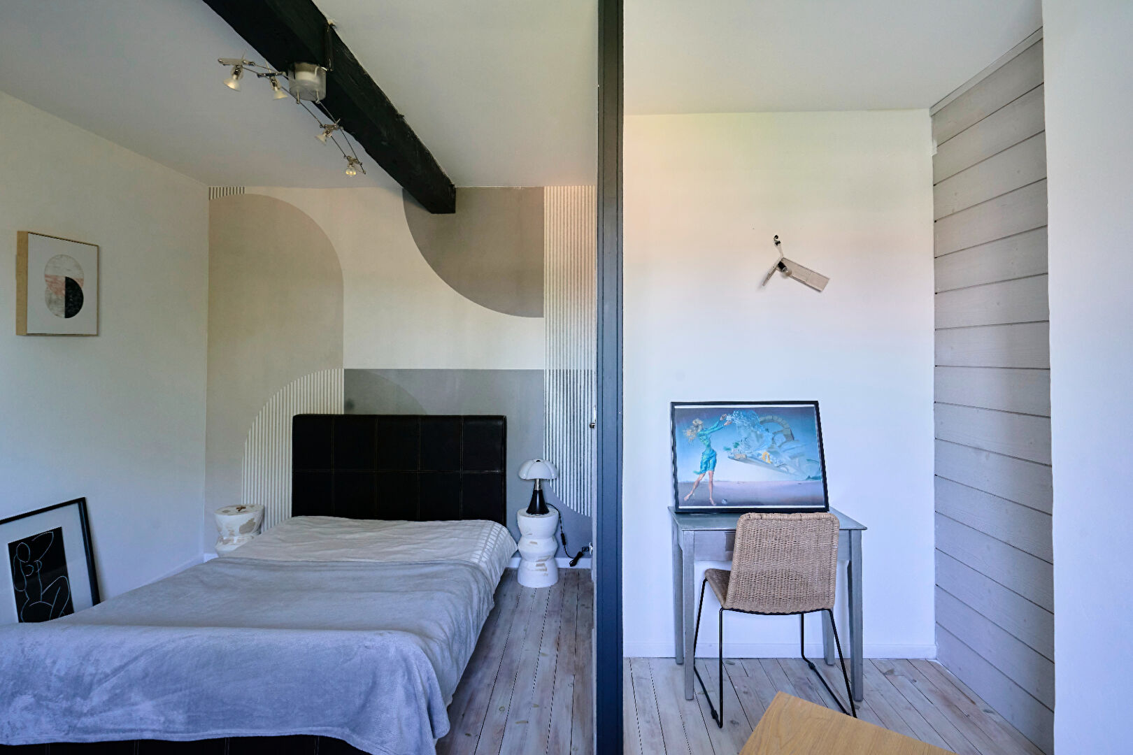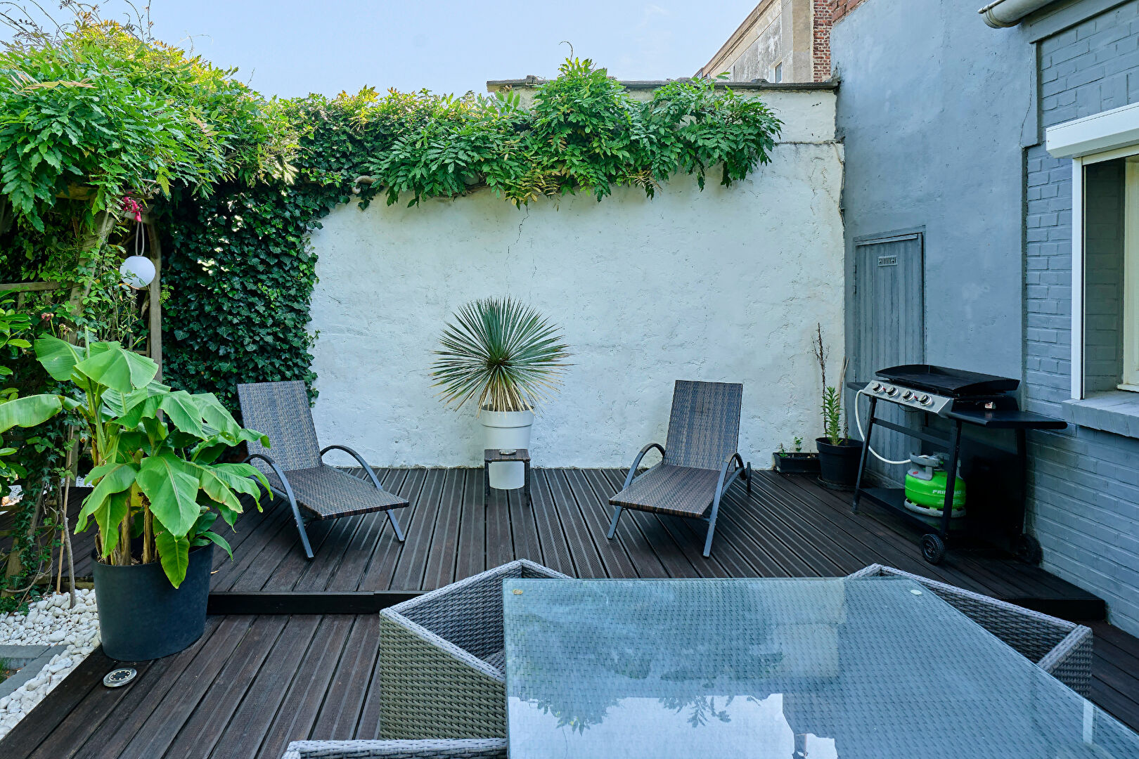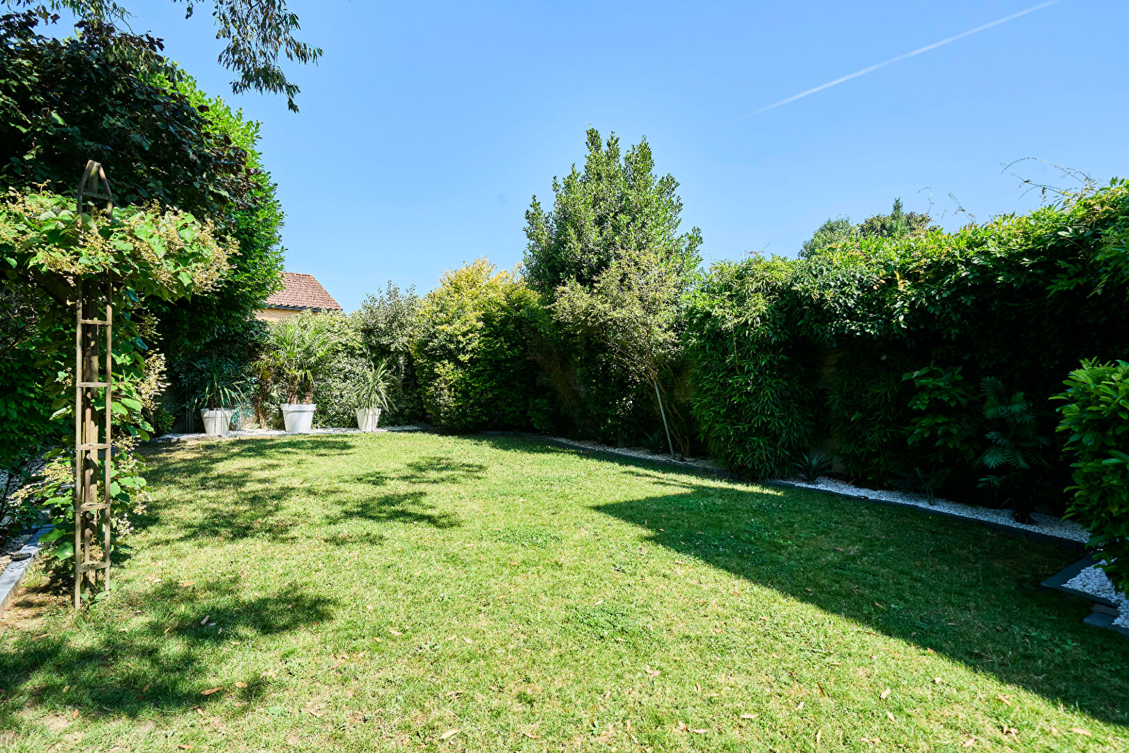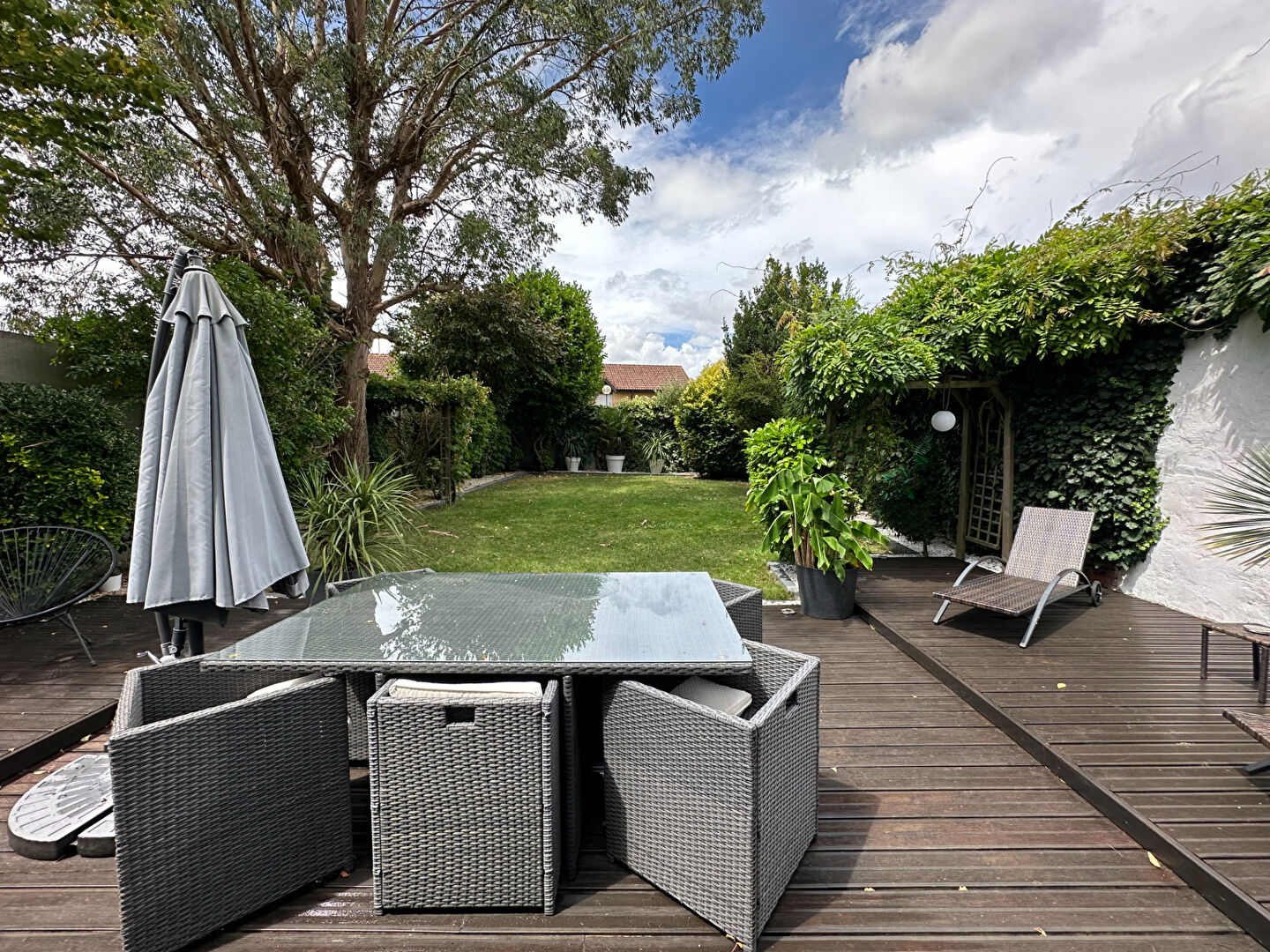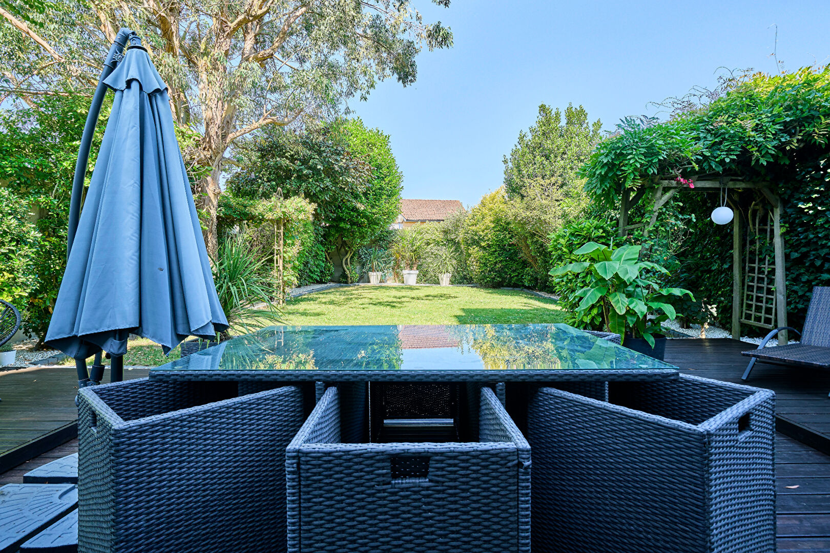 Elle s'ouvre directement sur une grande terrasse en bois et un jardin arboré sans vis-à-vis, parfait pour les repas en extérieur, les moments de détente ou pour laisser les enfants jouer en toute sécurité.