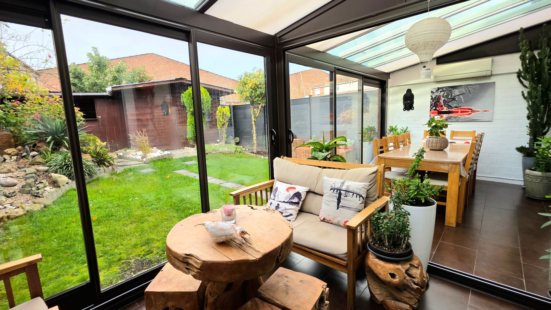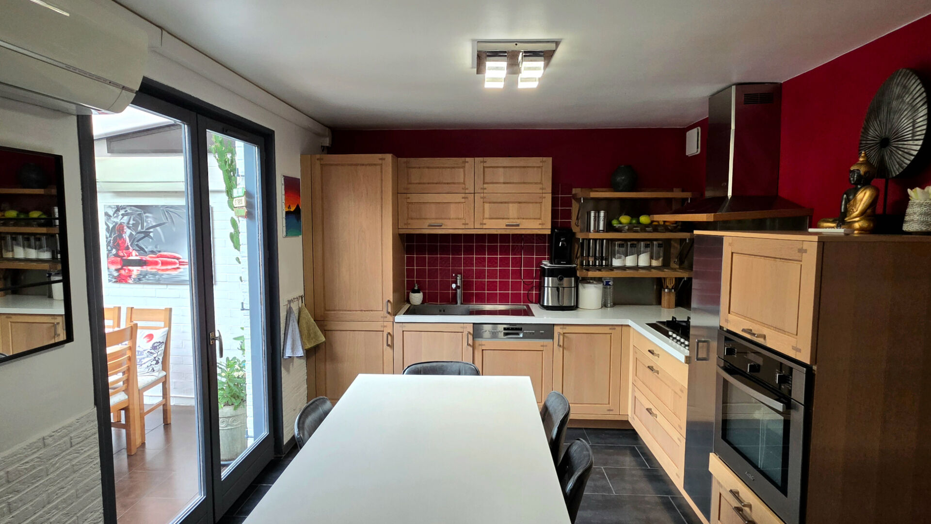 Cette maison dispose d'un grand séjour traversant, d'une cuisine aménagée et équipée, ainsi qu'une très belle véranda s'ouvrant sur un jardin paysager exposé ouest.
