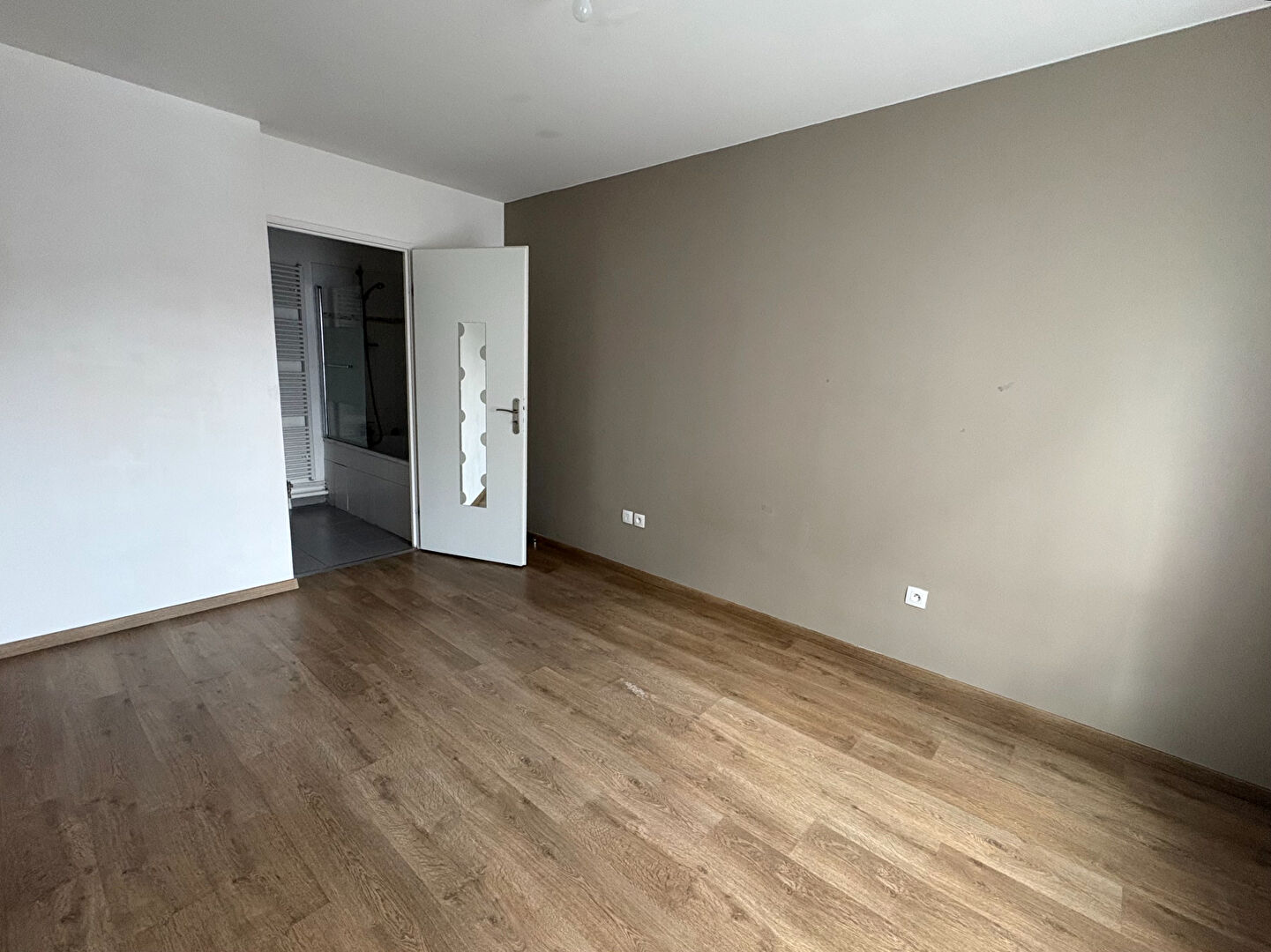 La chambre, attenante à la salle de bain, offre un agencement pratique et confortable.