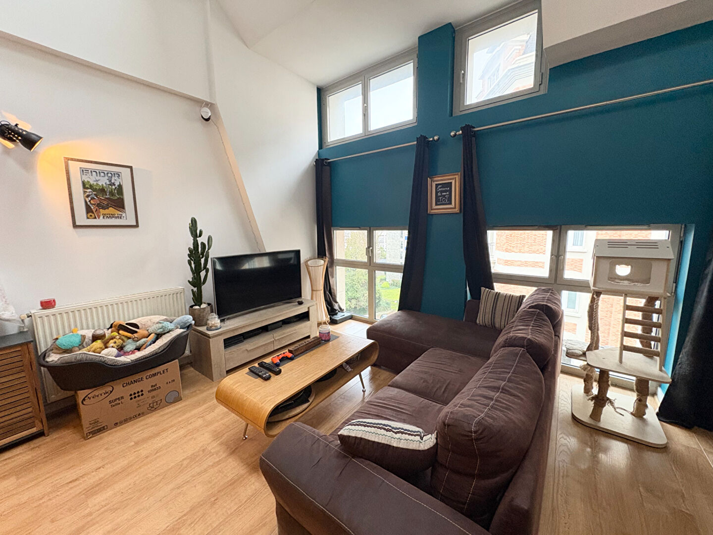 Dans l'entrée de l'appartement se trouve le WC, puis séjour avec coin cuisine équipée, un escalier menant à une mezzanine pouvant faire office de bureau et la chambre attentante à la salle de bain (baignoire).