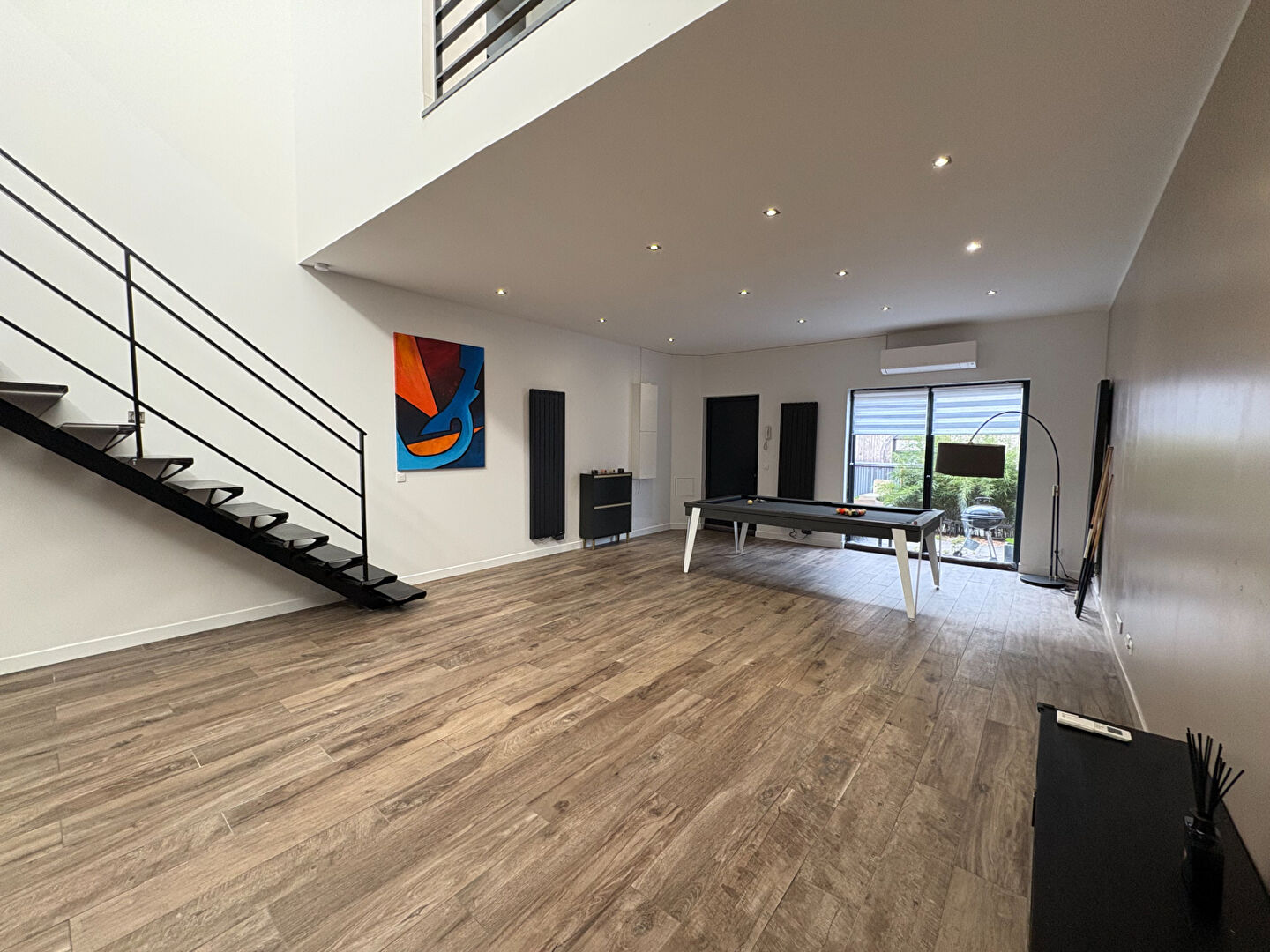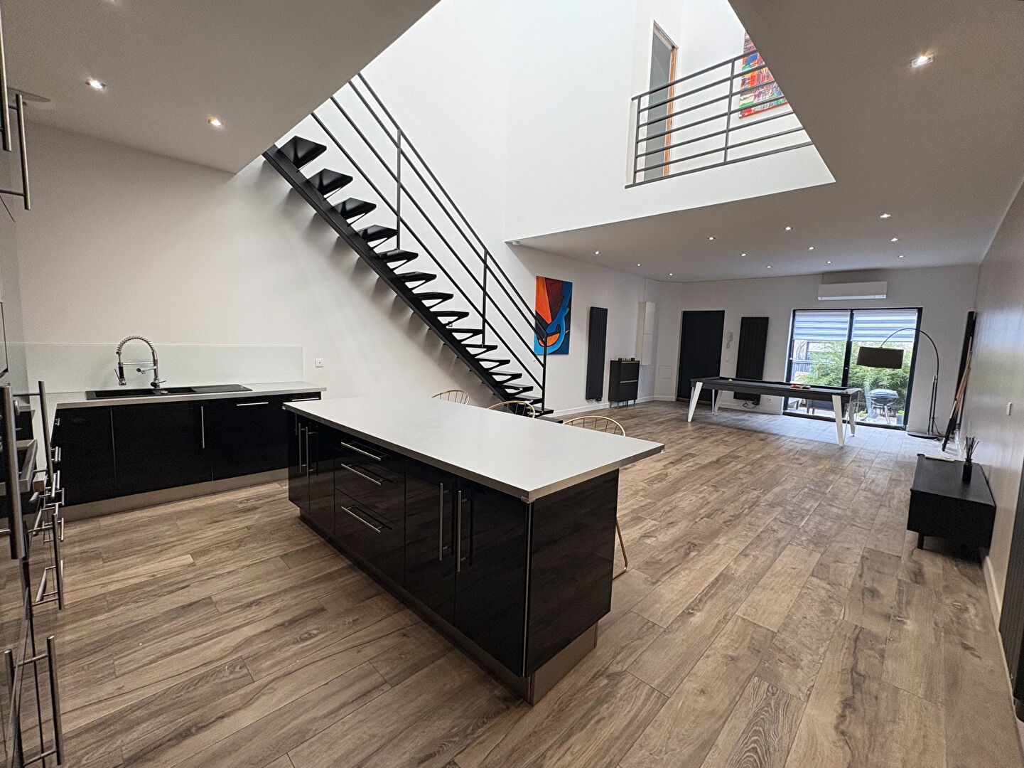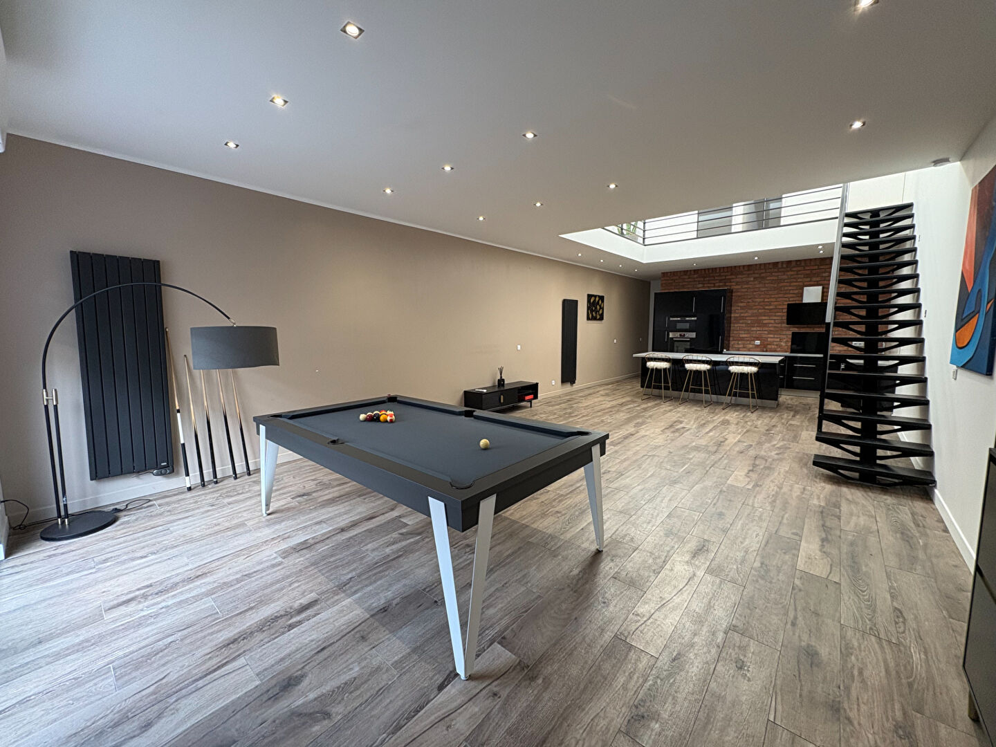 Au rez de chaussée, vous retrouverez un bel espace de vie de 56 m2 comprenant salon, séjour, cuisine équipée ouverte ainsi qu'un billard restant à disposition, apportant un cachet supplémentaire. Une buanderie, un wc et un bureau complètent ce niveau.