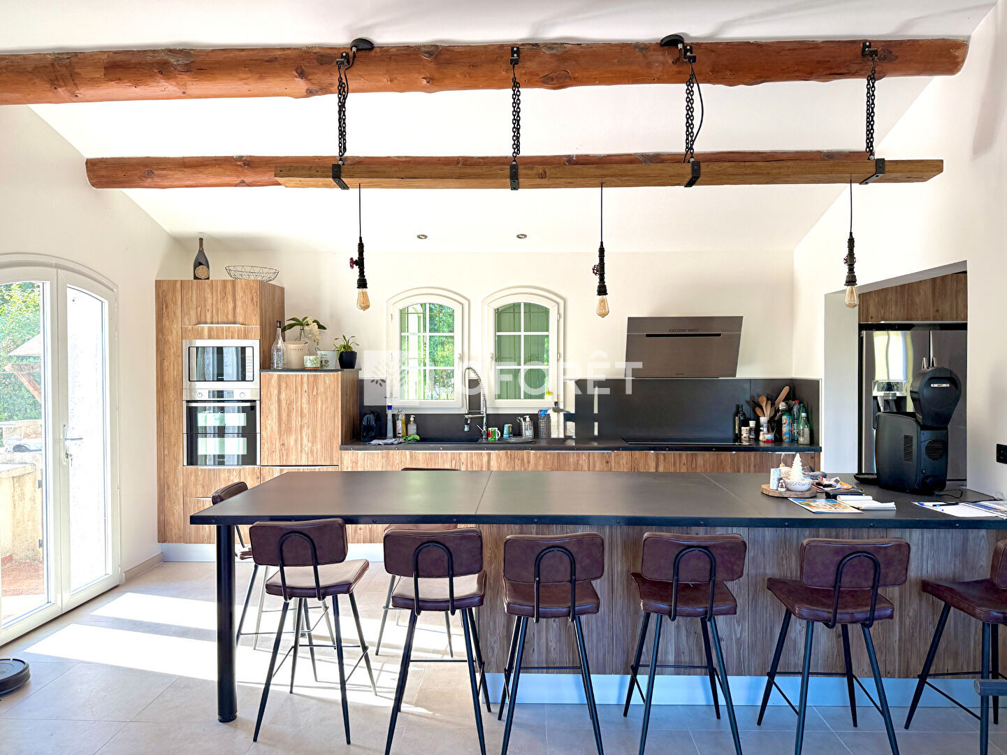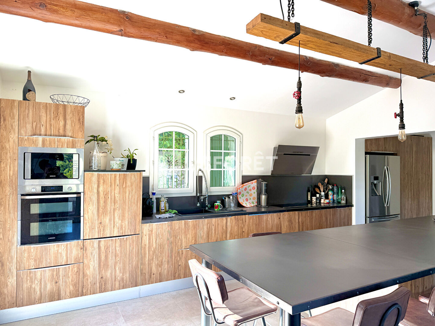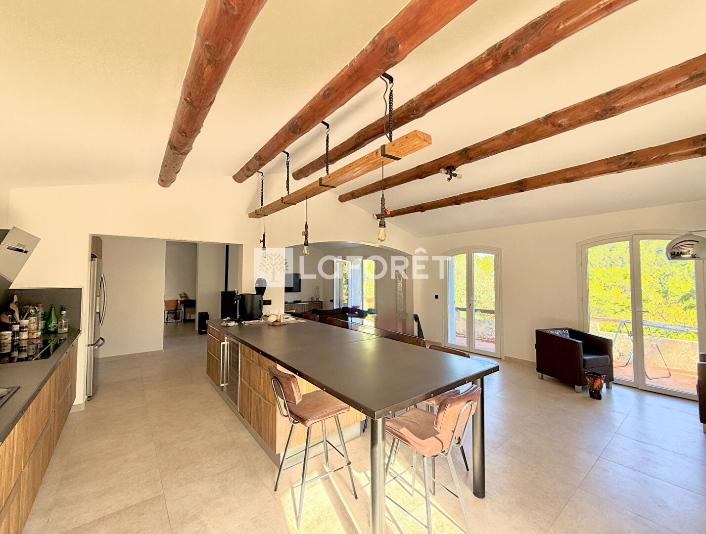 Le séjour de 60 m² est un véritable atout : lumineux, spacieux, équipé d'un poêle à bois, il s'ouvre sur une cuisine américaine moderne entièrement équipée, parfaite pour profiter d'un espace de vie convivial.