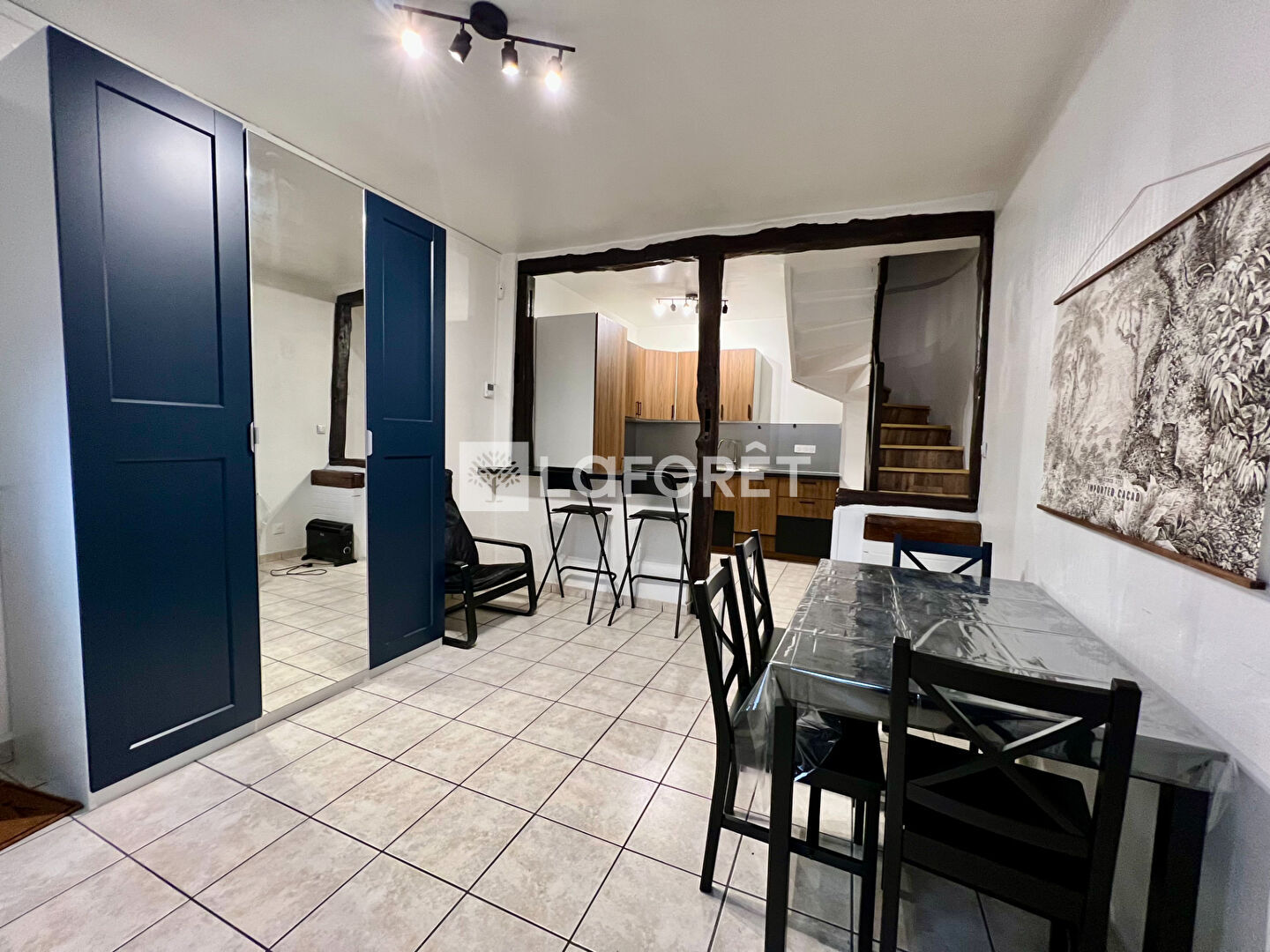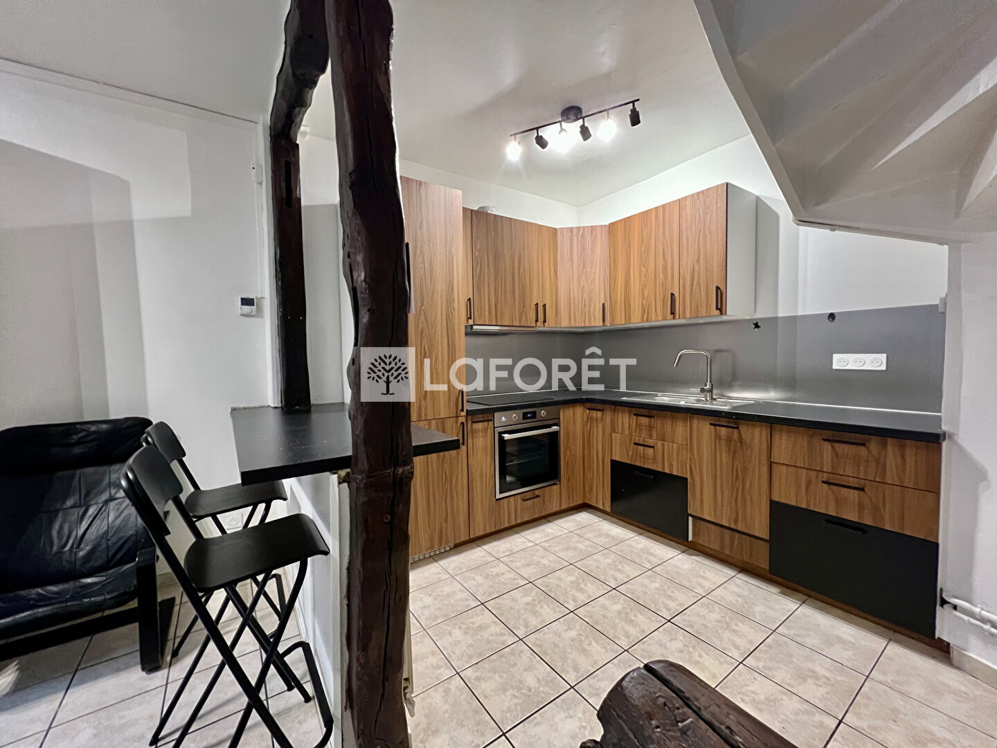 Elle comprend au rez-de-chaussée : une pièce de vie avec sa cuisine aménagée et équipée ouverte.