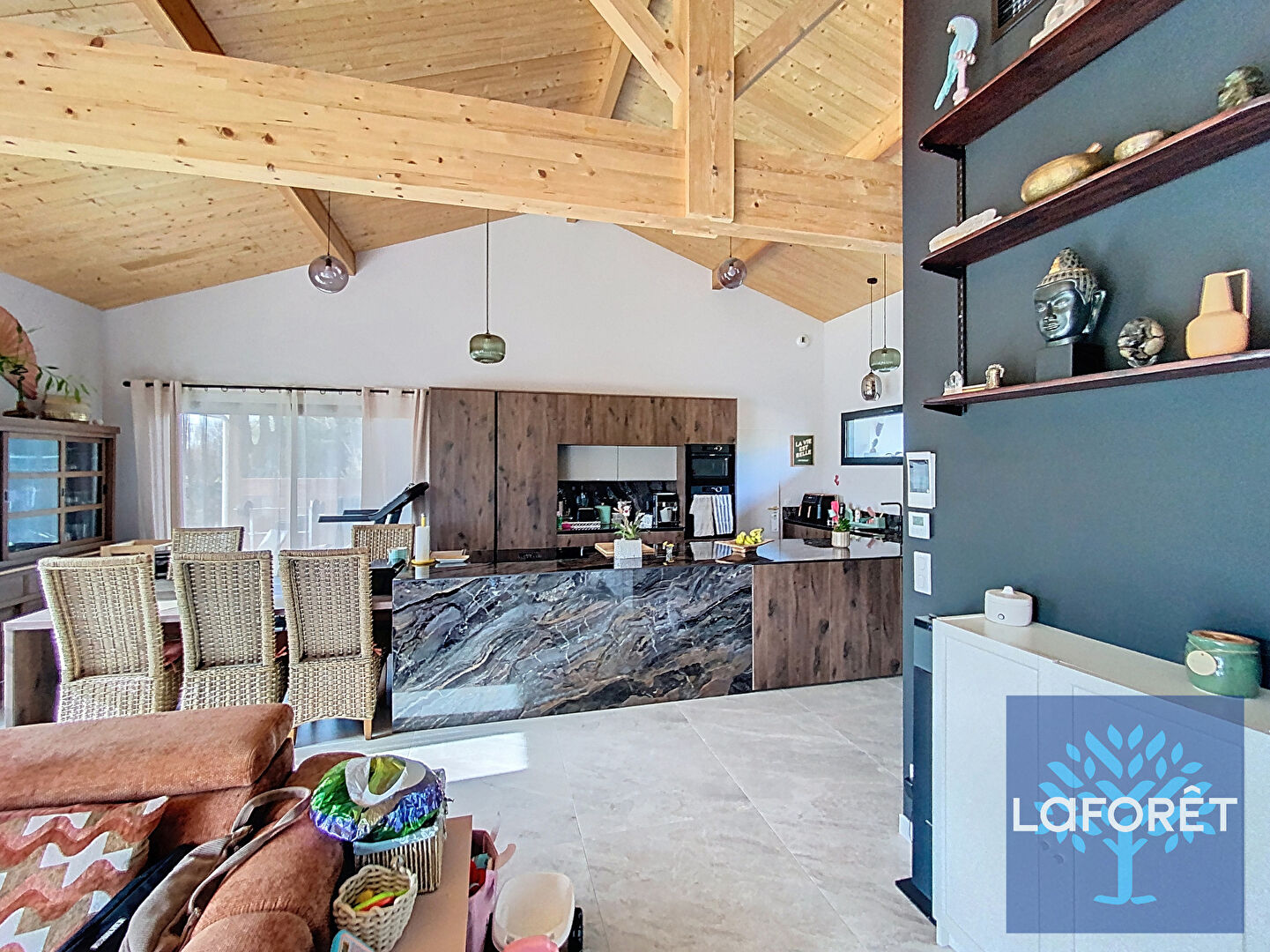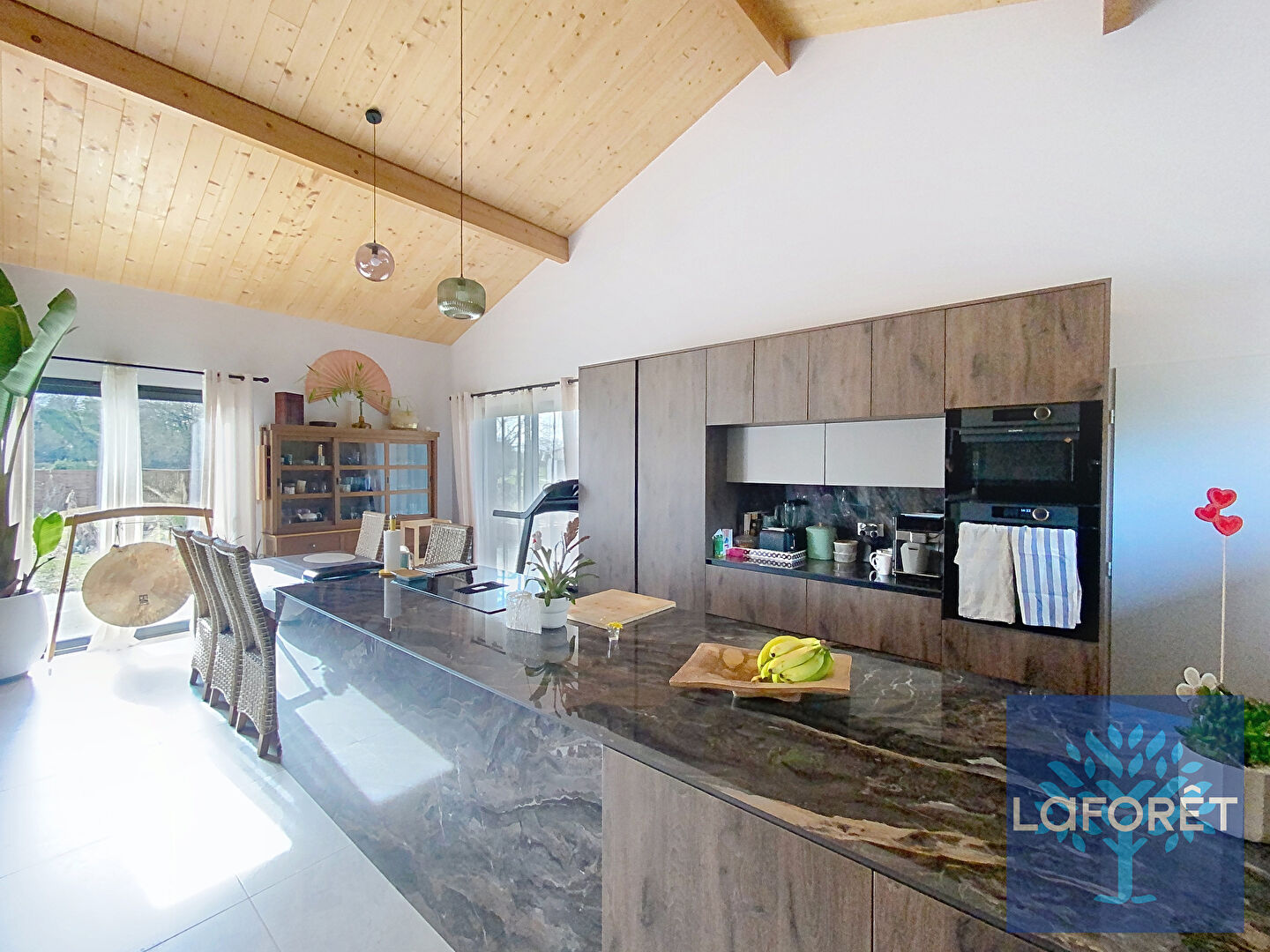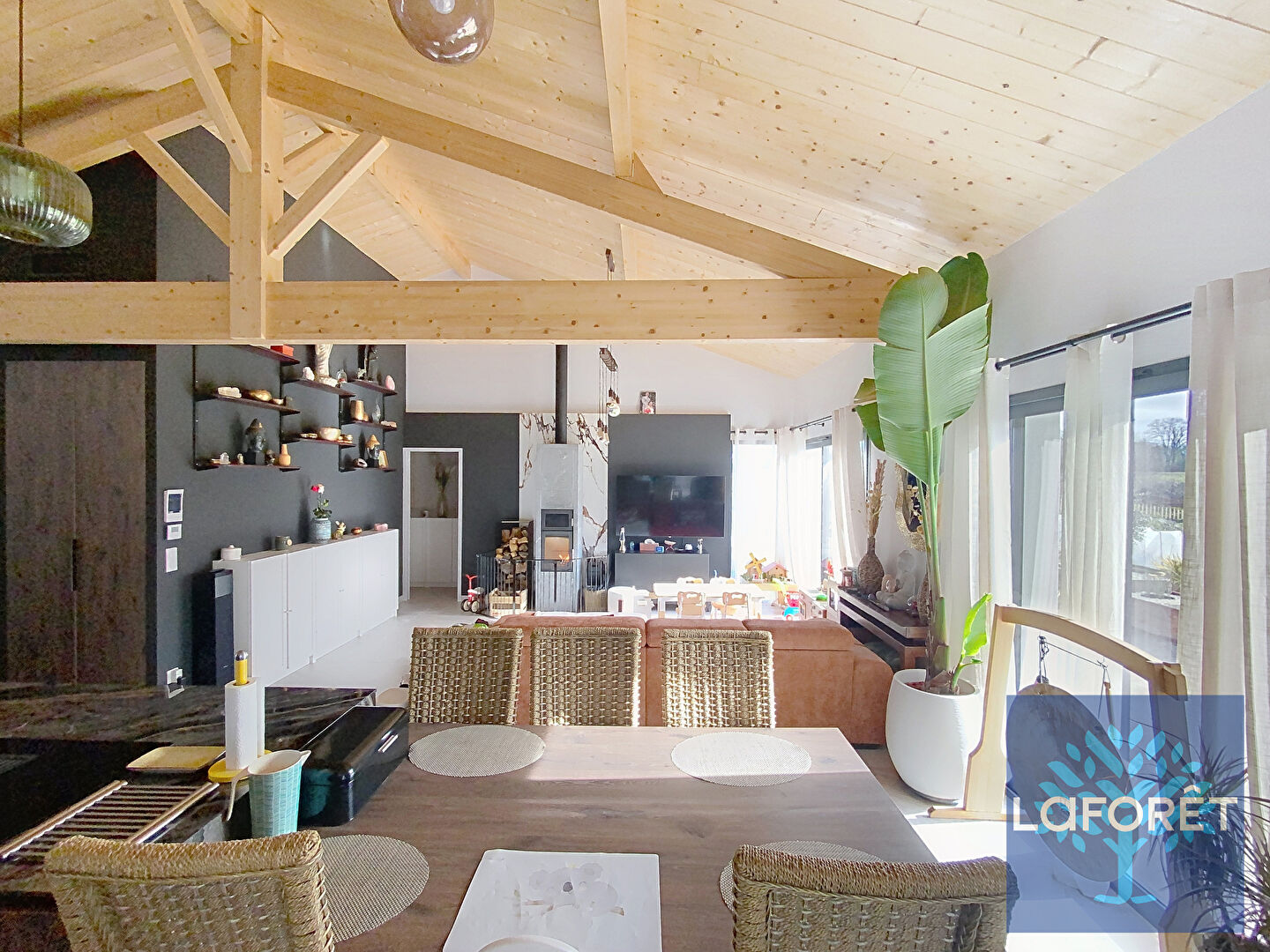 Implantée sur un terrain clôturé de 1 500 m² piscinable, hors lotissement, dans un environnement calme et recherché, cette propriété séduit par la qualité de ses matériaux et sa charpente traditionnelle apparente.