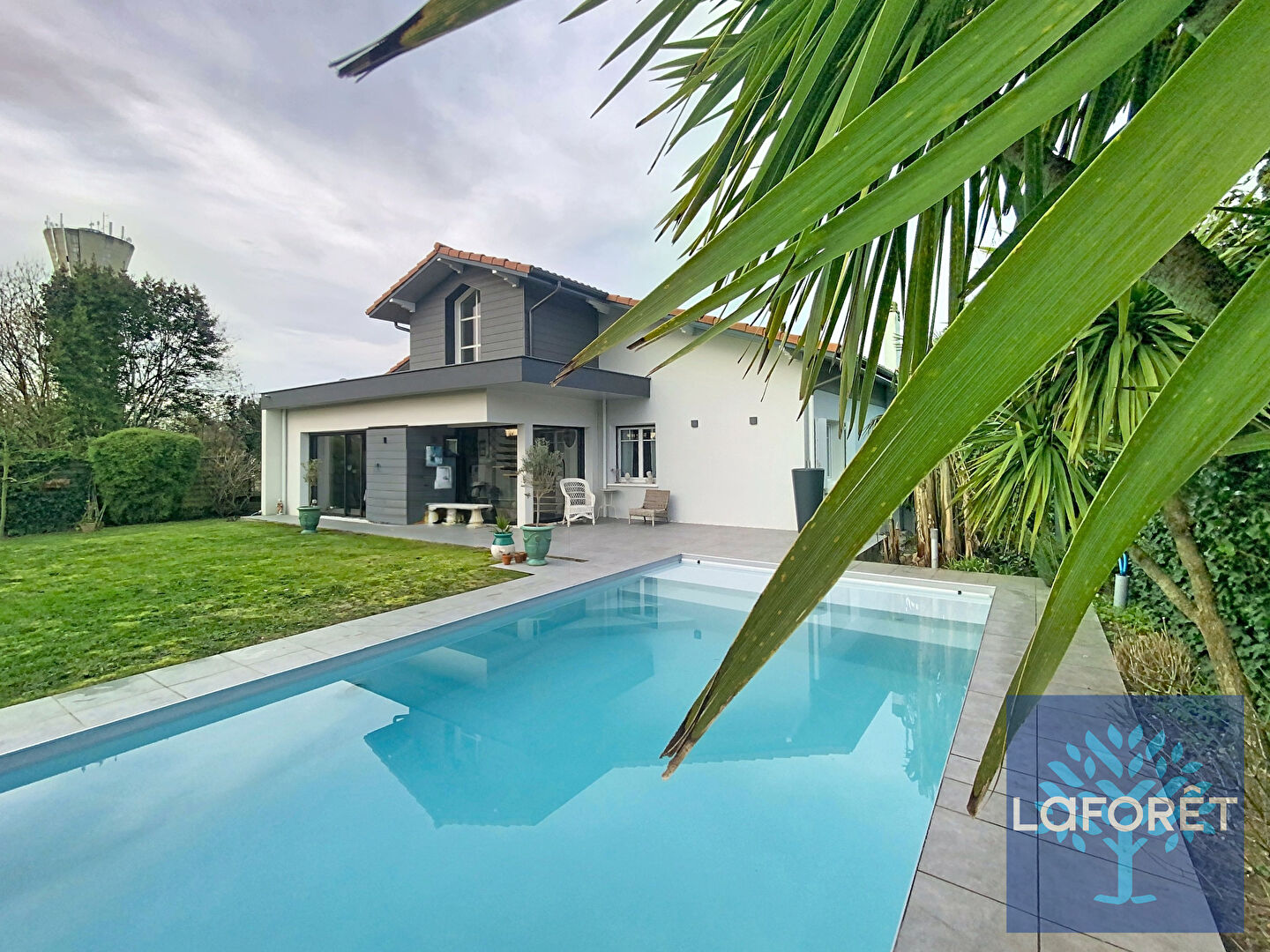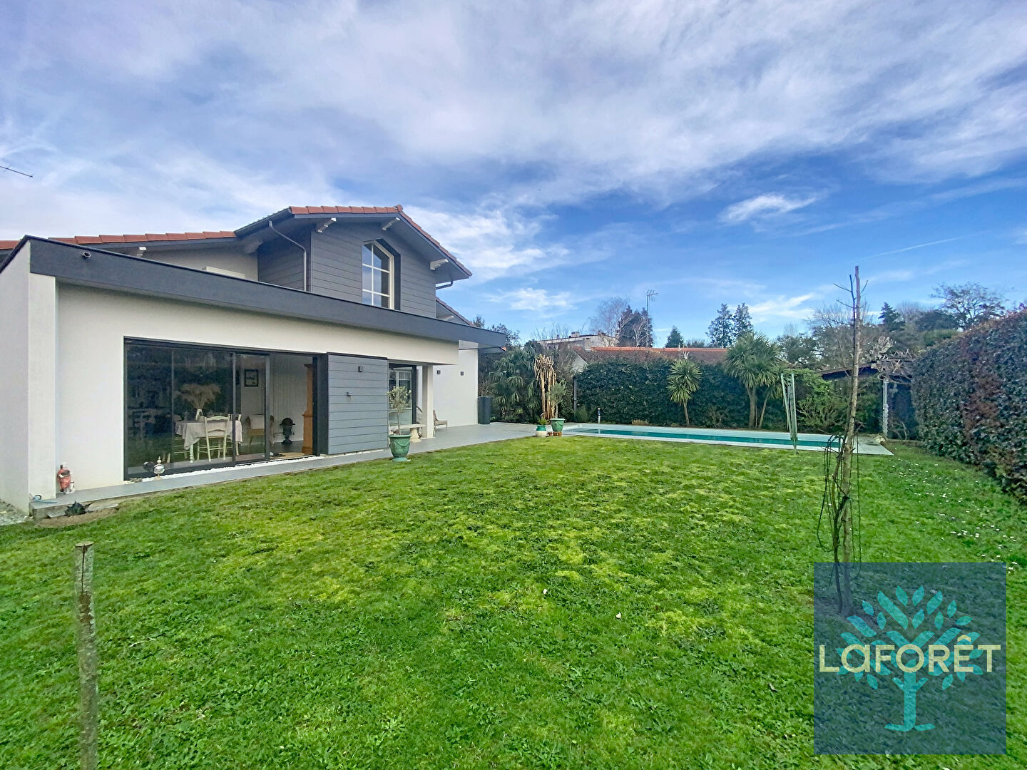 Déployée sur un terrain paysagé de 700 m² avec piscine de 35 m², la propriété conjugue architecture de caractère et prestations contemporaines.