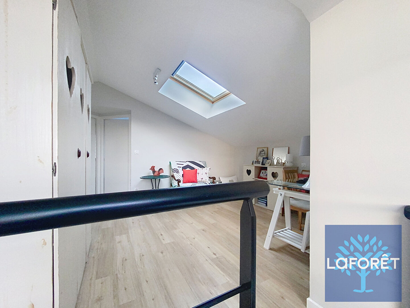 Un escalier bois et métal, véritable signature architecturale, mène à une mezzanine élégante desservant deux chambres et une salle d'eau.