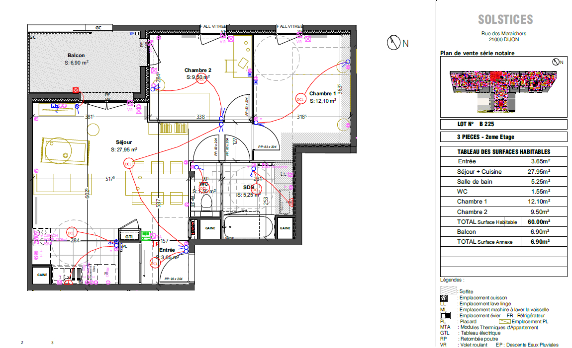 Dans la résidence neuve de 2026 Soltices, T3 au 2eme étage n°B225, comprenant une entrée avec un placard, un séjour-cuisine (sera équipée de plaque de cuisson, hotte, meubles, emplacement lave vaisselle) donnant sur un balcon, deux chambres dont une chambre donnant sur le balcon, une salle de bains, un WC séparé. Loué avec un stationnement couvert n° P46. Disponible début avril. Honoraires en sus : 666 euros (dont 181.80 euros d'état des lieux)