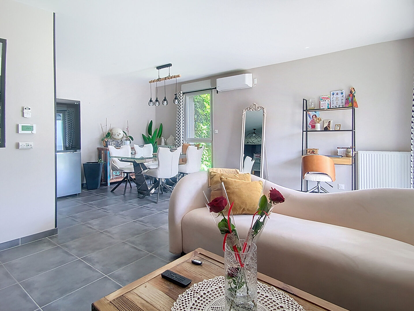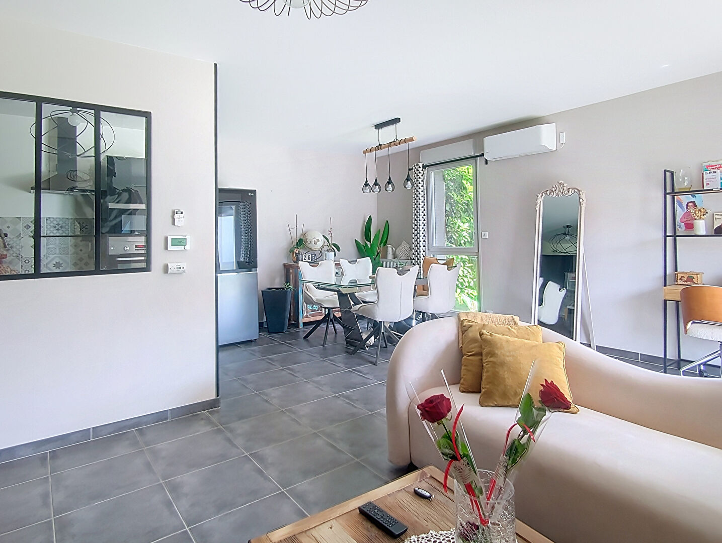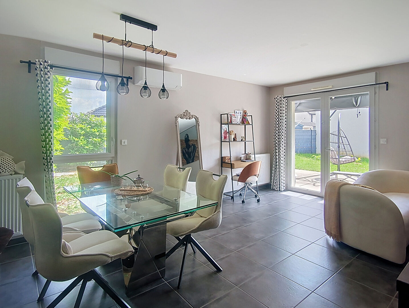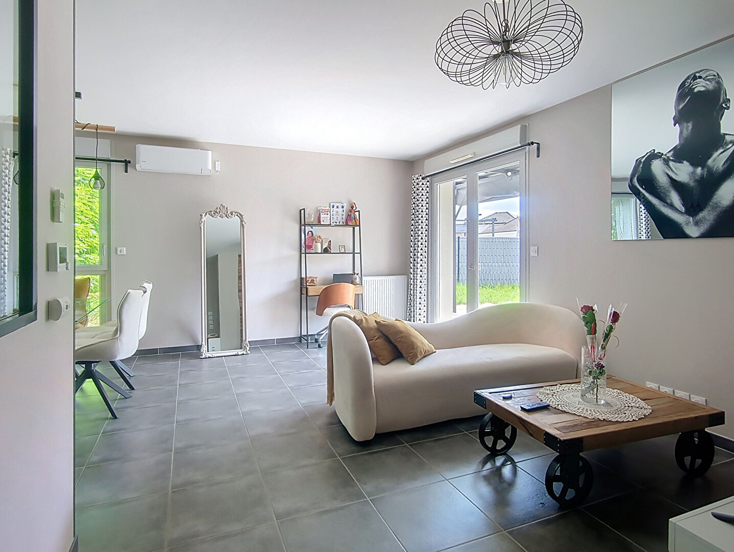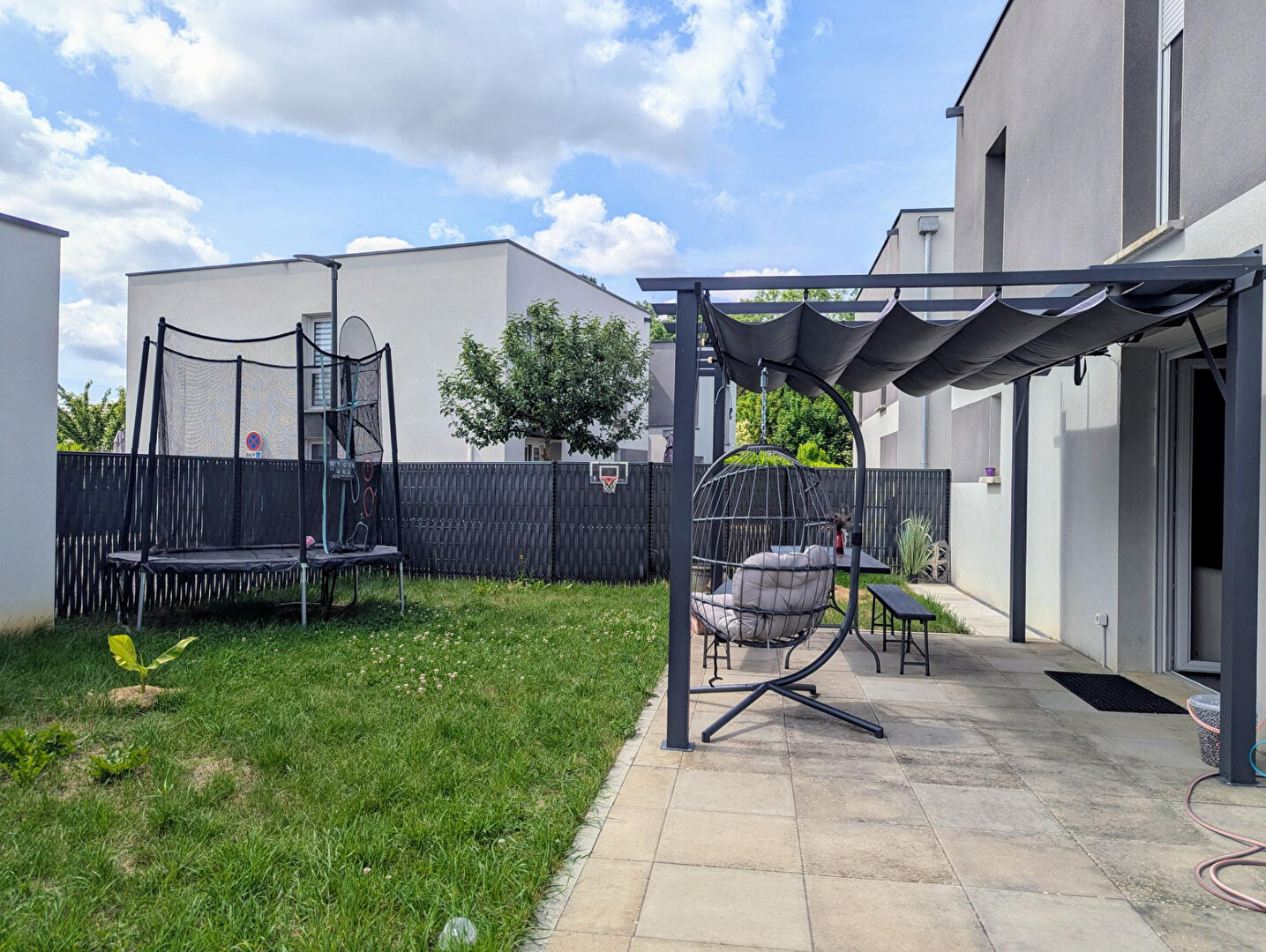L'appartement bénéficie d'une terrasse et d'un jardin clos avec pergola et abri de jardin. Il est équipé d'un chauffage au gaz et d'une climatisation réversible. Performance énergétique : DPE B.