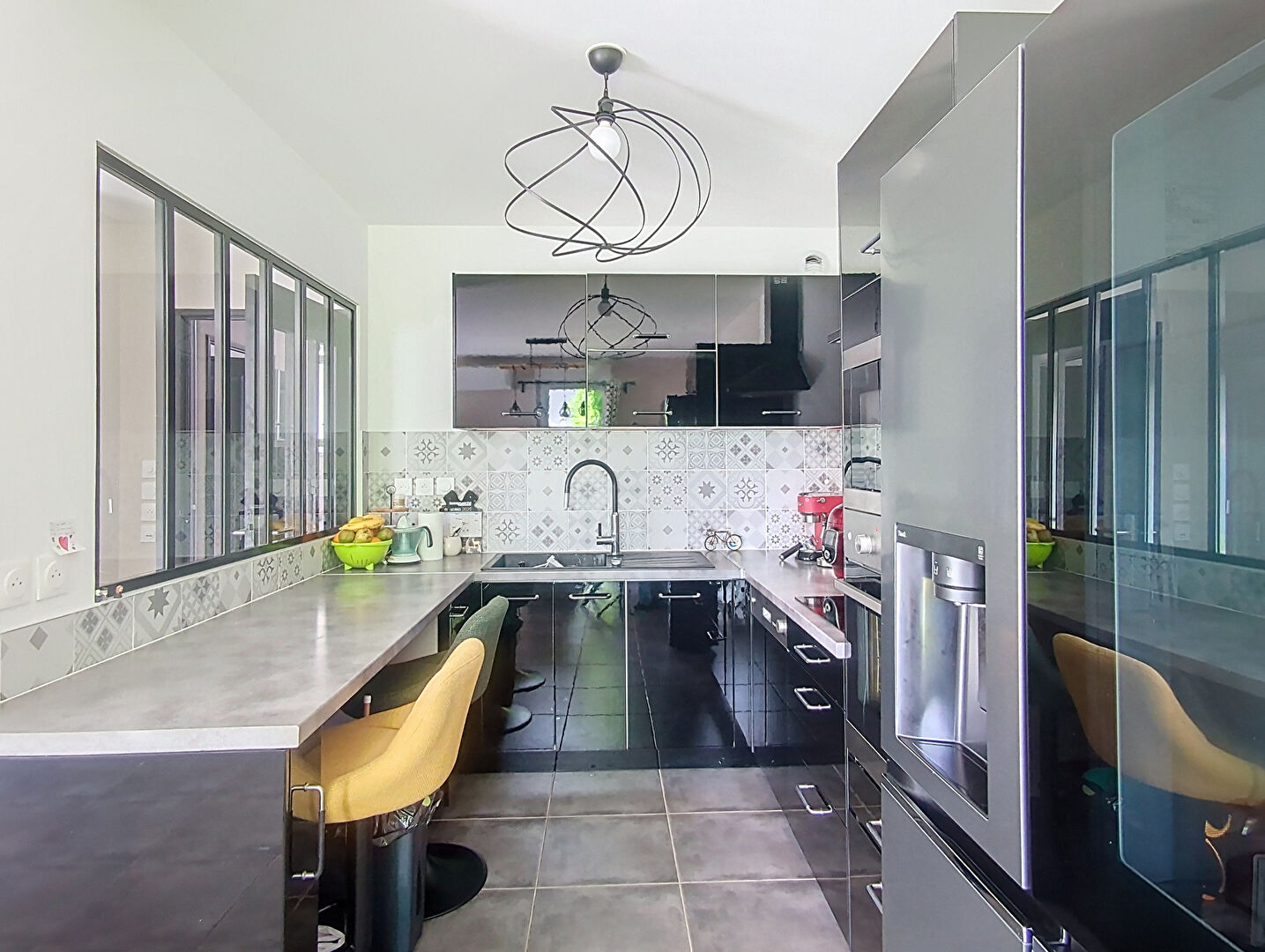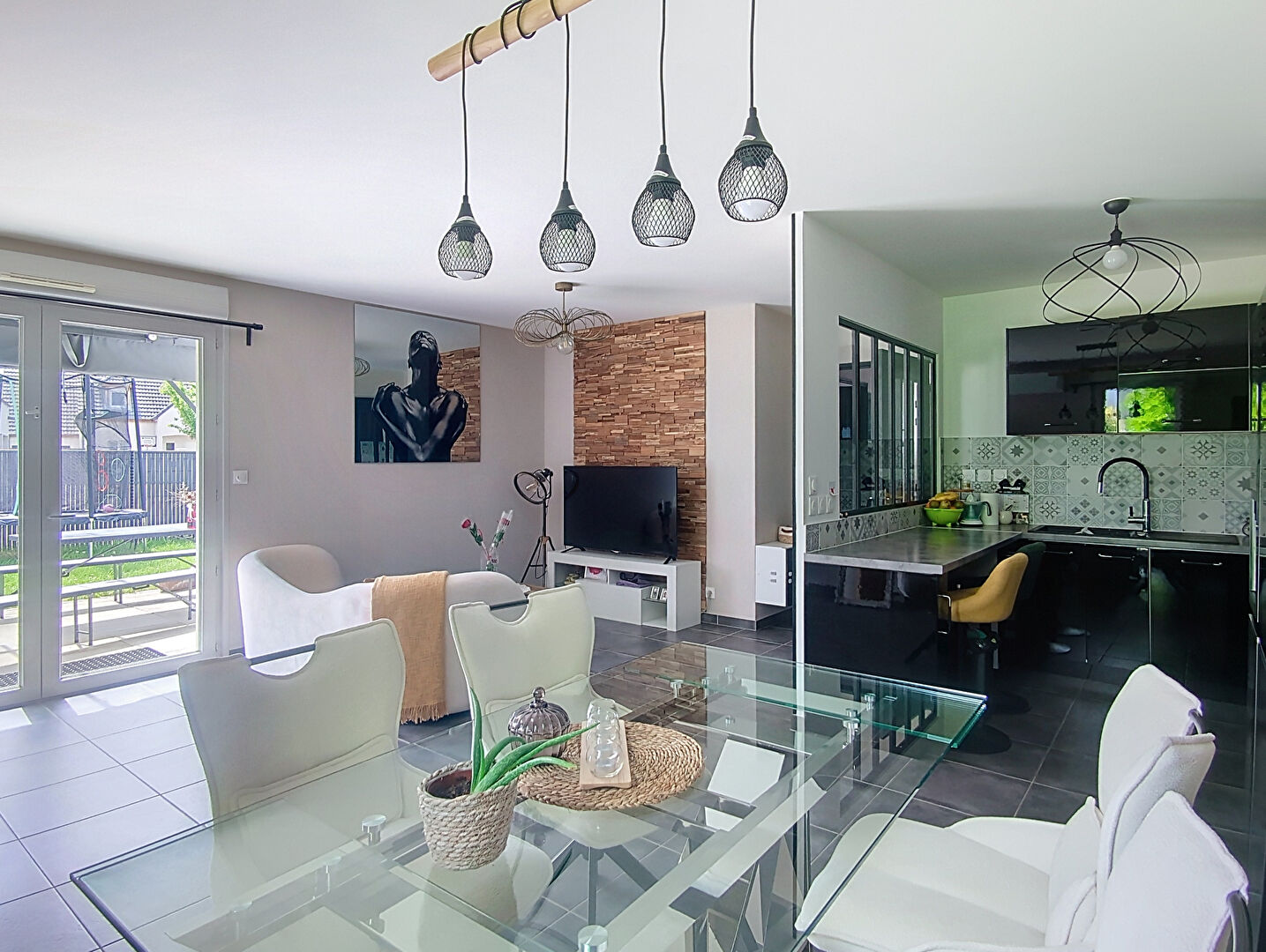 Au rez-de-jardin, : entrée, d'un séjour avec cuisine équipée (comprenant four, plaque à induction, hotte, micro-ondes intégré et branchement pour lave-vaisselle), d'une salle d'eau avec branchement pour machine à laver ainsi que d'un cellier.