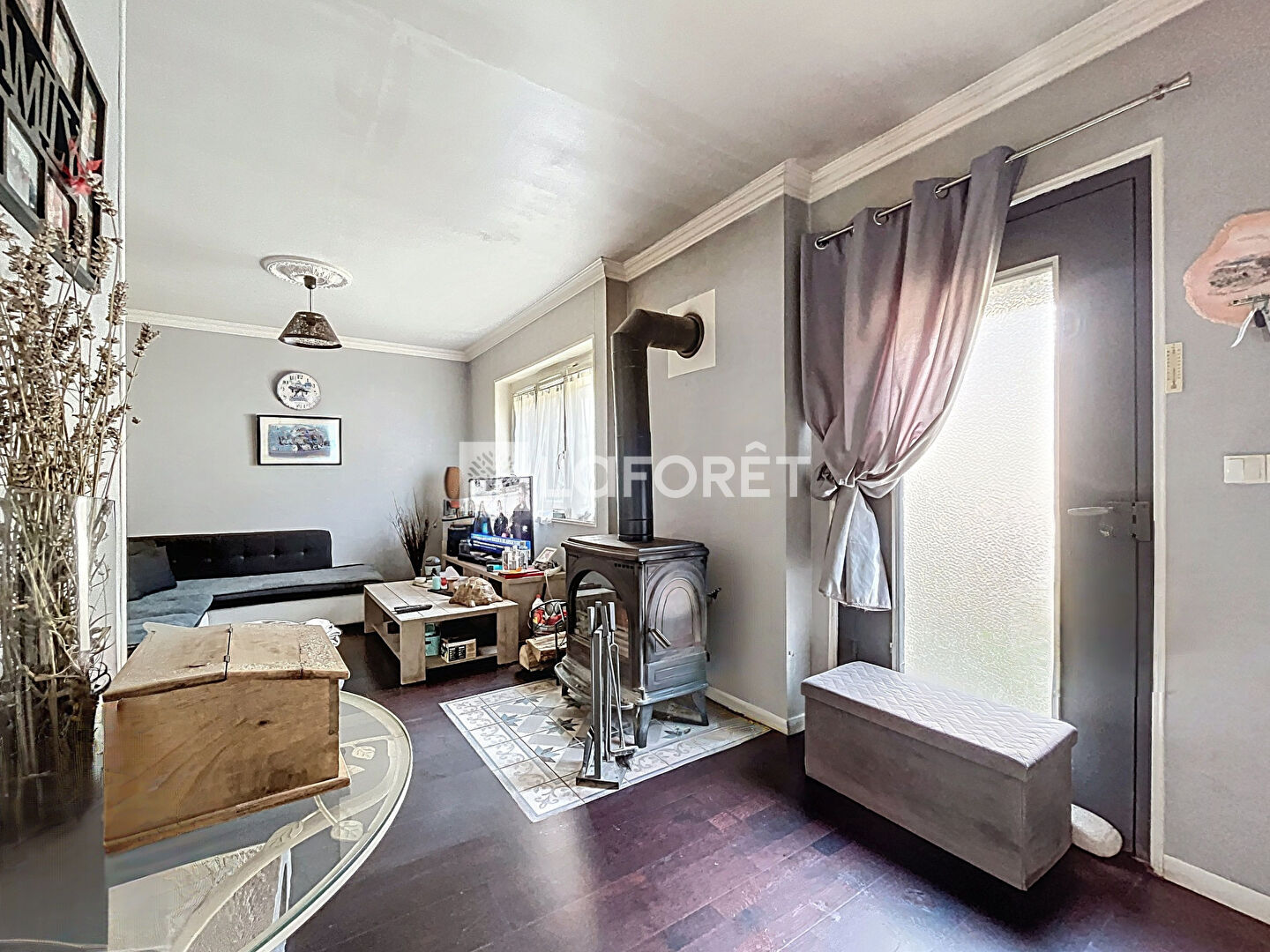 Au rez-de-chaussée, vous découvrirez une cuisine / salle à manger spacieuse, une buanderie, un w.c, un salon avec poêle à bois, une chambre et une cave.