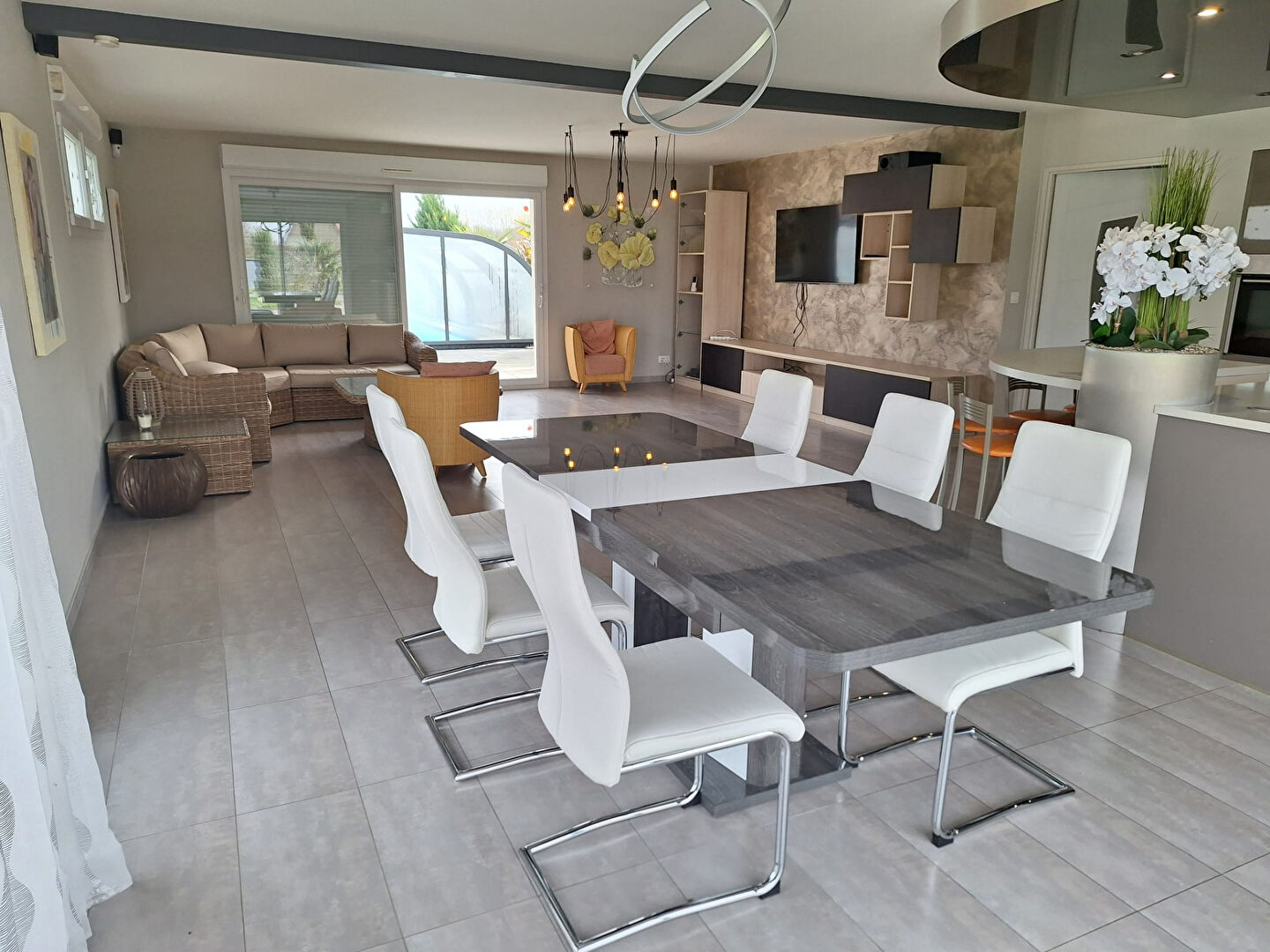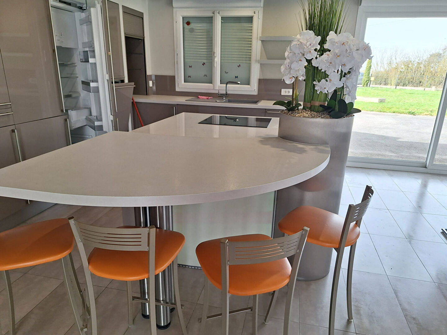 Une grande cuisine ouverte sur pièce de vie très lumineuses donnant sur terrasse