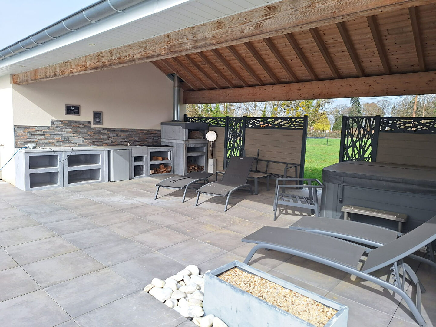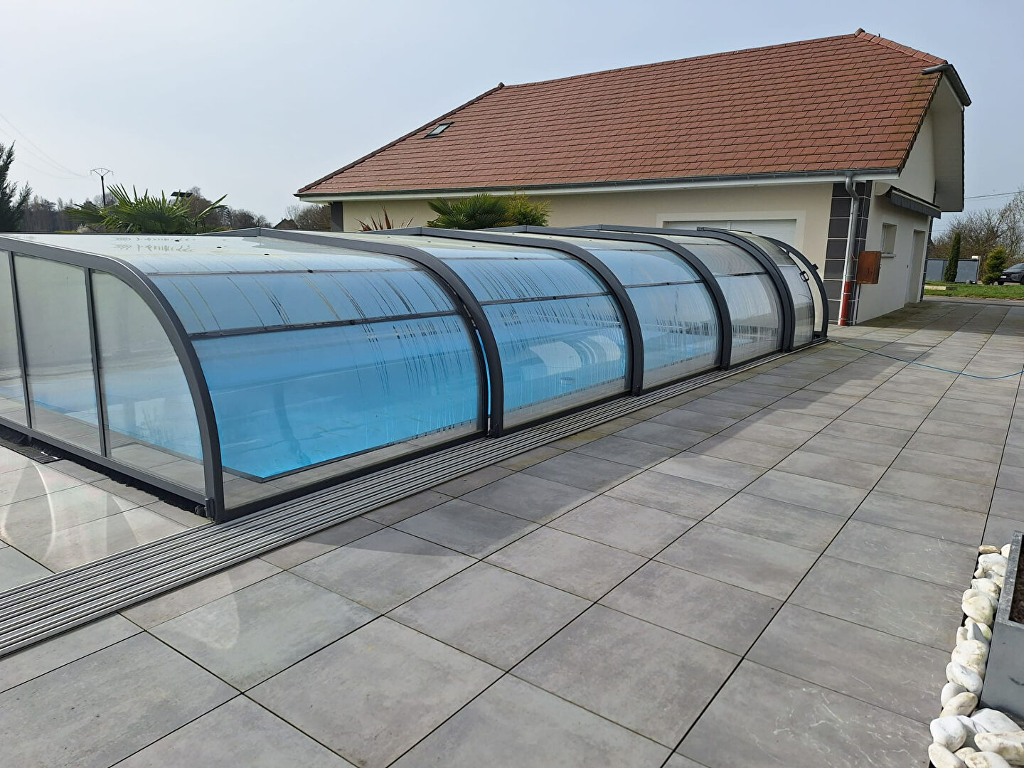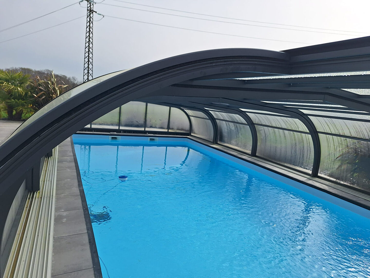 A l extérieur, le terrain arboré offre un cadre de vie rare et privilégié avec piscine couverte et chauffée propice à la détente et aux moments conviviaux .