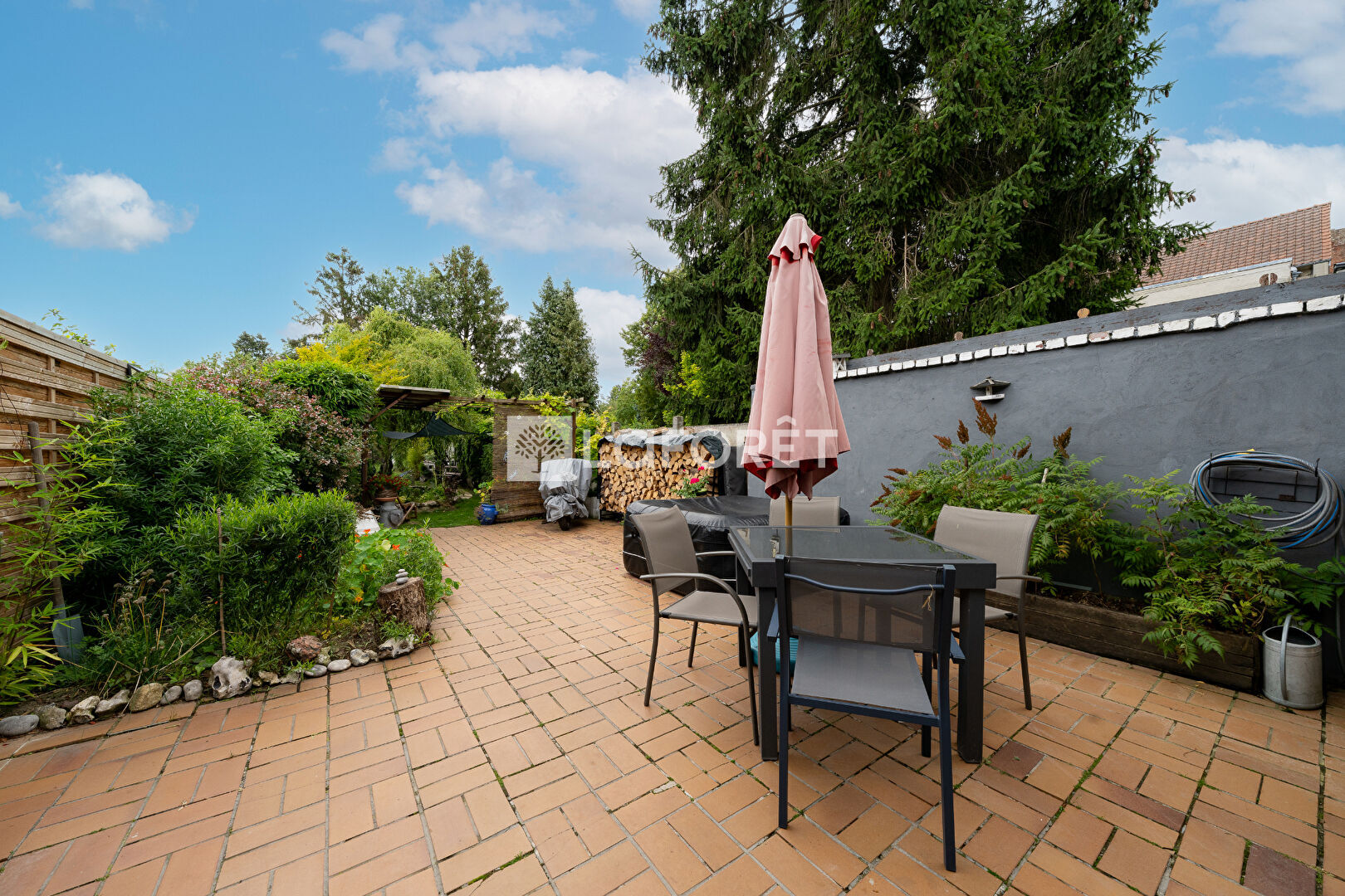 Une terrasse carrelée, un beau jardin avec vivier, une cave et une place de stationnement privative complètent ce bien.