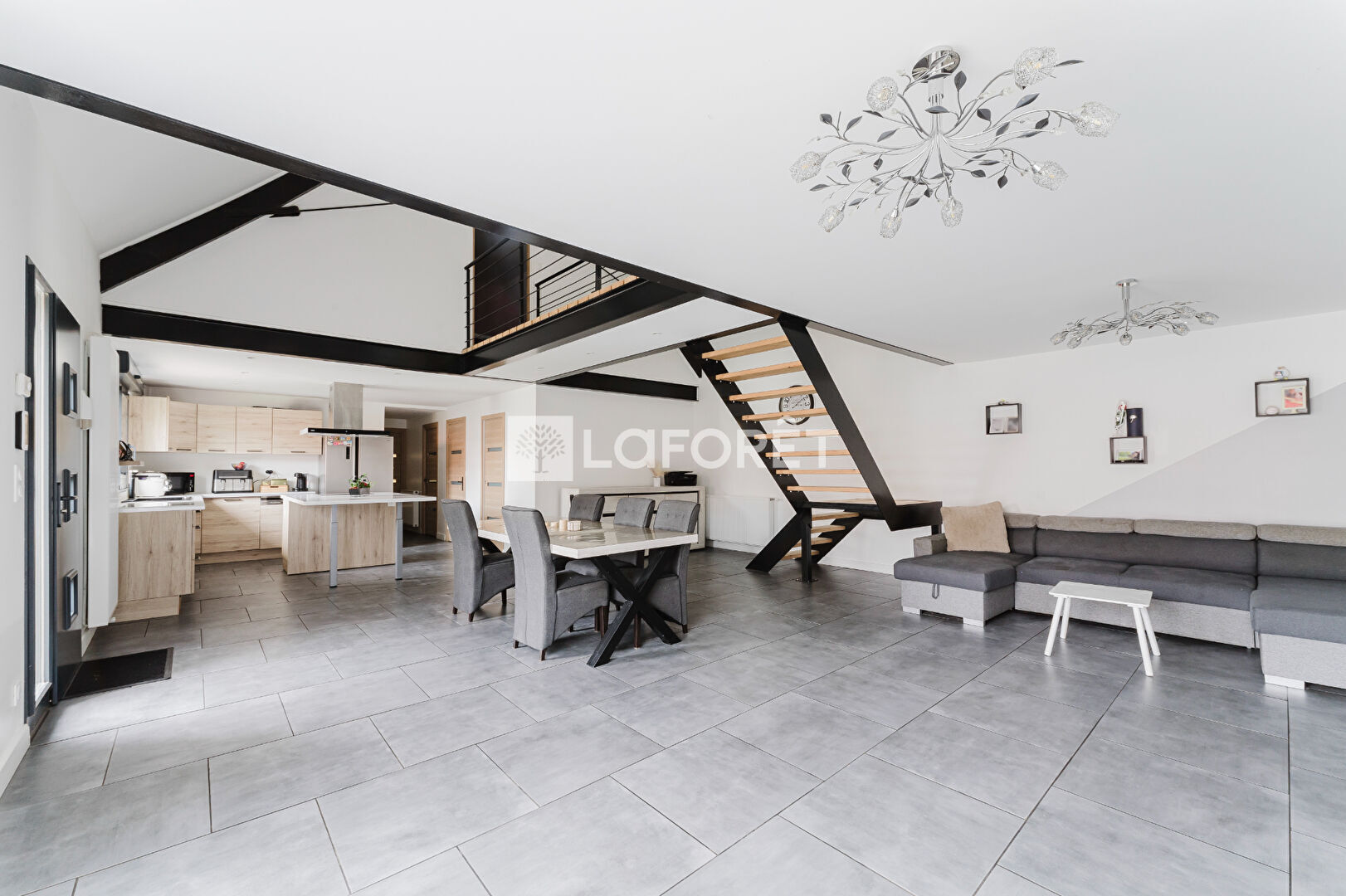 Elle dispose de très beaux espaces avec un séjour d'environ 50 m², spacieuse cuisine ouverte aménagée et équipée, cellier/buanderie, salle de bains au rdc avec douche et baignoire, ainsi qu'un bureau de 8.40 m²