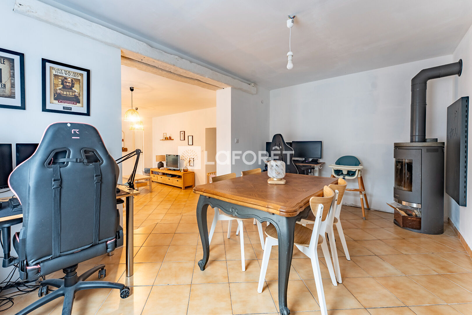 Jolie maison de ville individuelle développant 138 m² habitables et comprenant salle à manger, salon avec son poêle à bois, cuisine, salle de bains, WC indépendants, véranda carrelée de 24 m² donnant accès aux extérieurs, trois chambres à l'étage