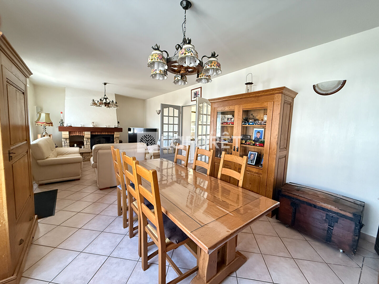Vous entrerez sur un spacieux salon avec insert à bois, en partie ouvert sur cuisine aménagée et équipée avec espace repas donnant sur la véranda, cellier, wc et salle de bains avec douche et baignoire.