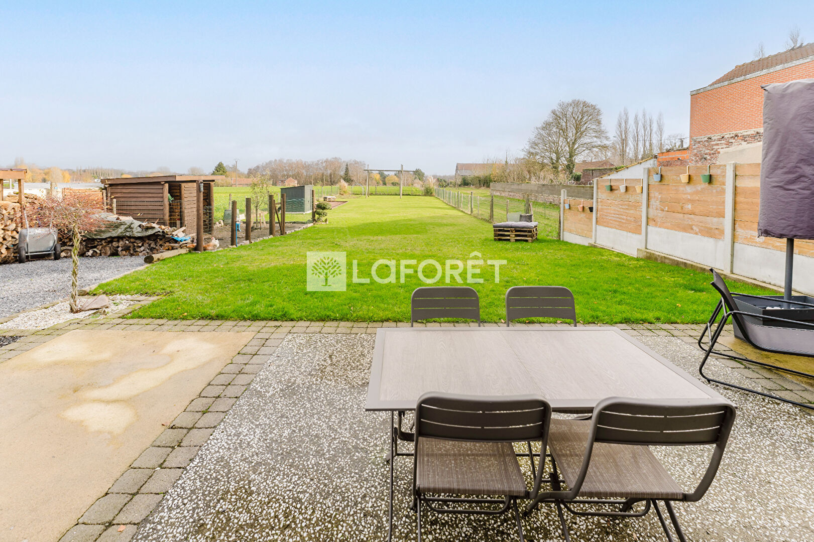Jardin, terrasse, grand parking extérieur, passage sur le côté.