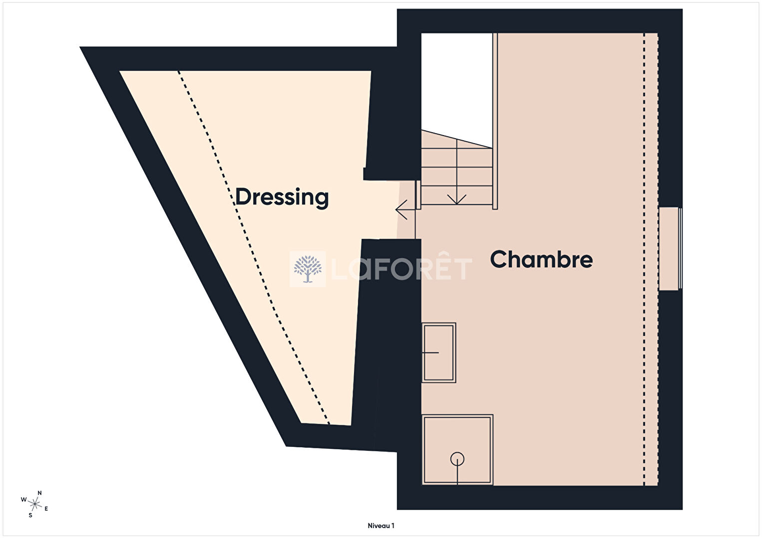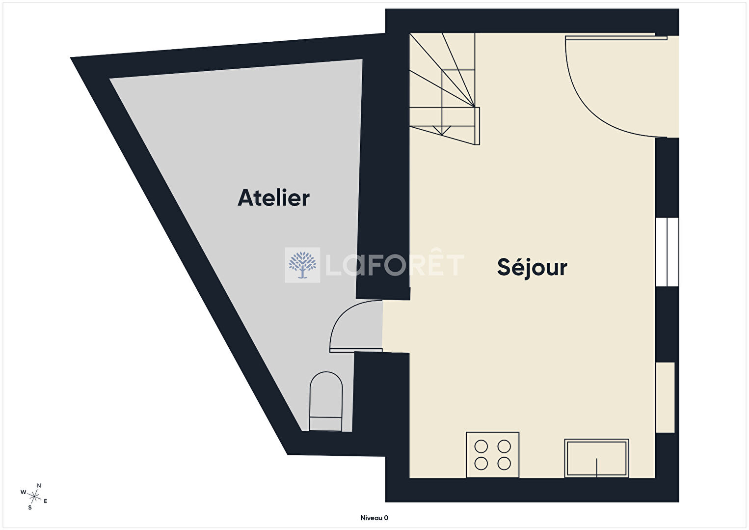 Elle se compose au rez-de-chaussée d'une pièce à vivre avec atelier à l'arrière et à l'étage d'une chambre avec point d'eau et espace dressing.