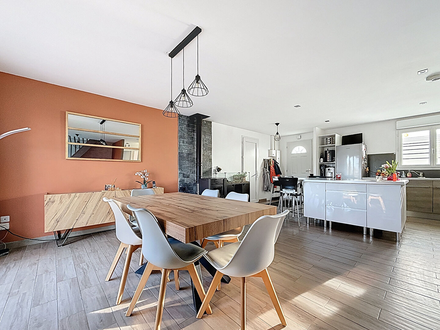 Vous découvrirez une cuisine aménagée et équipée, ouverte sur un salon/séjour lumineux, agrémenté d'un poêle à granulés, ainsi que deux chambres en rez-de-chaussée et une salle d'eau.