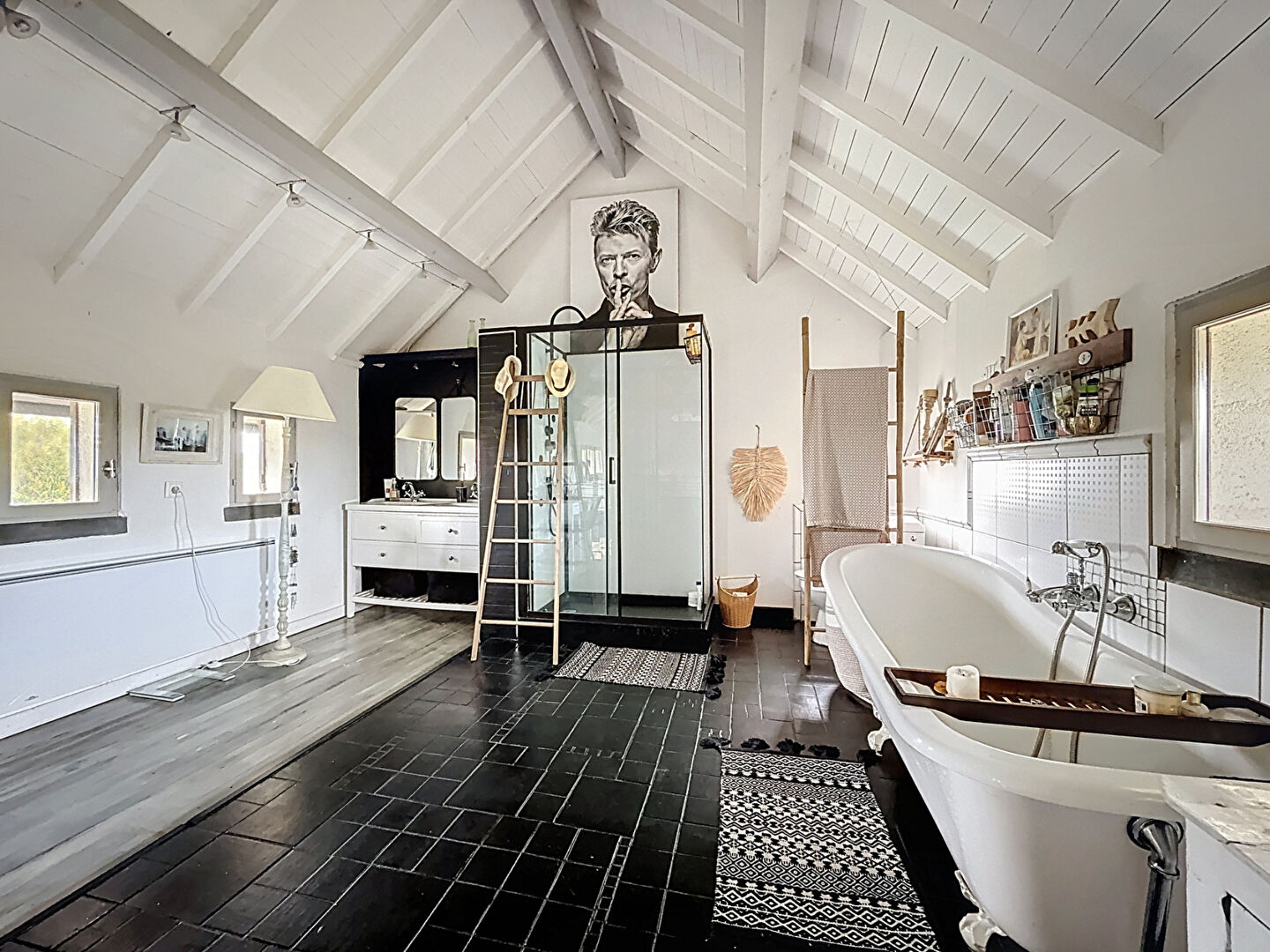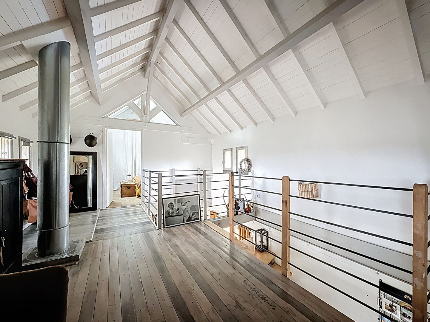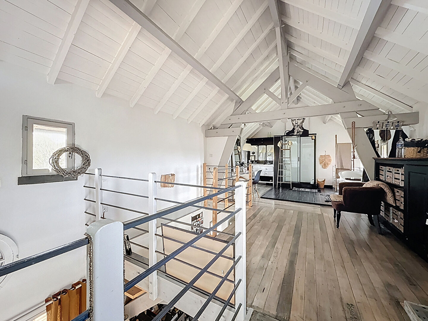 A l'étage, une salle de bain ouverte sur la mezzanine et une chambre.