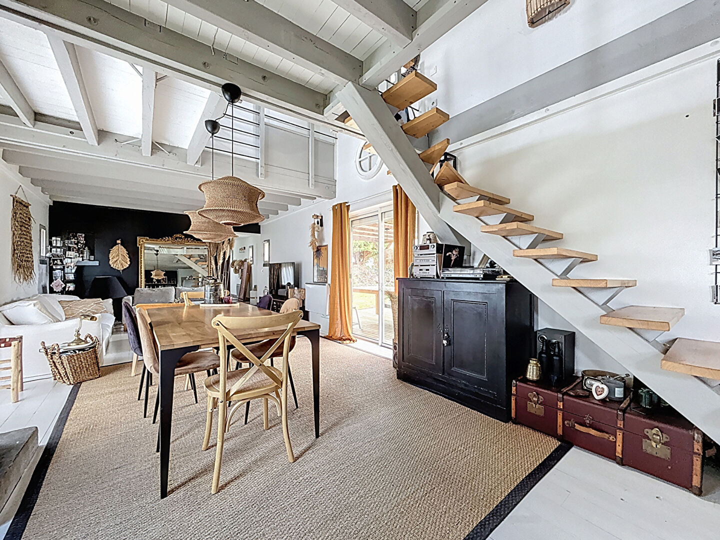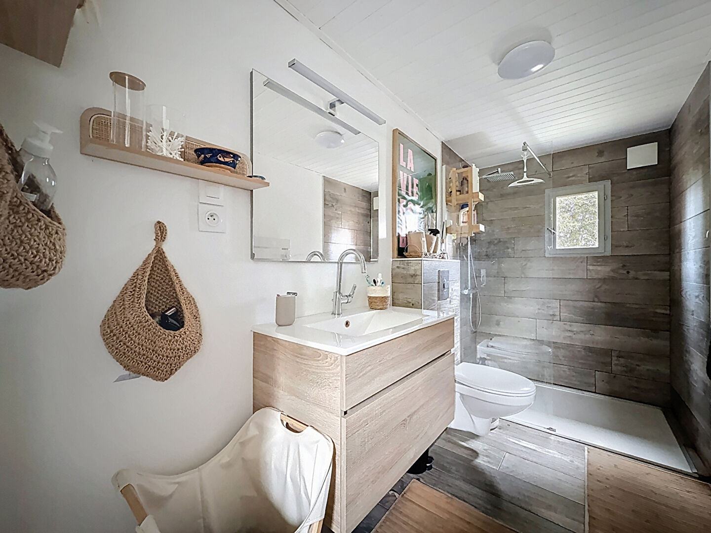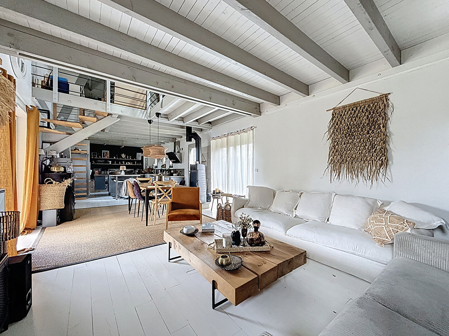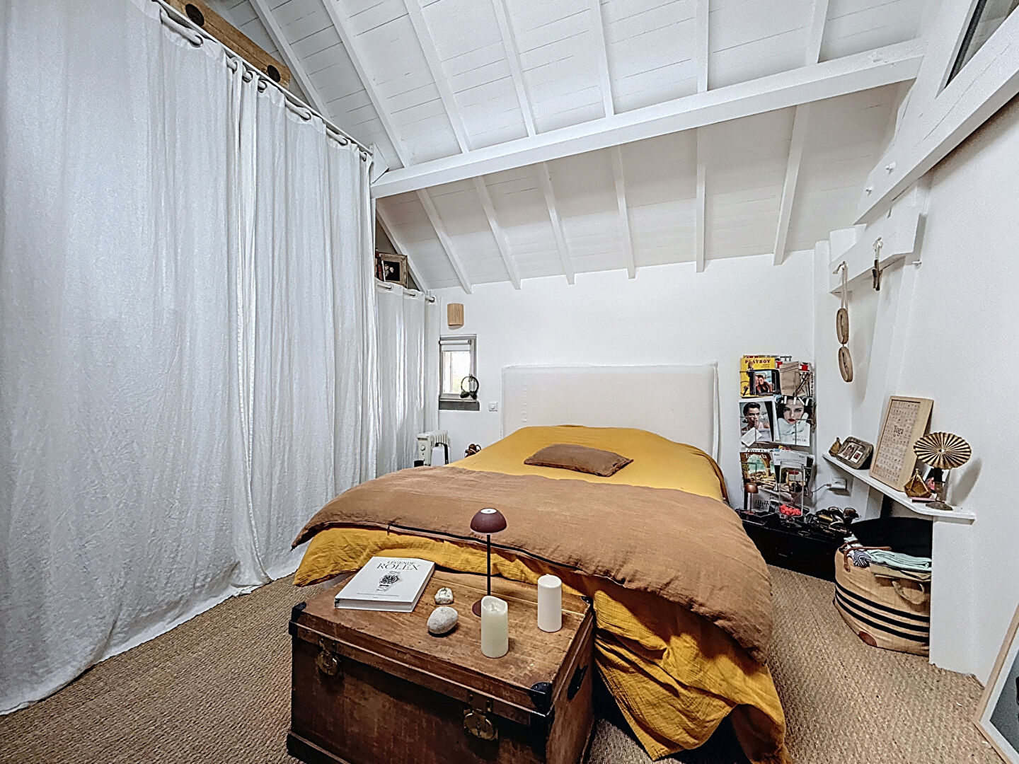 A l'étage, une salle de bain ouverte sur la mezzanine et une chambre.