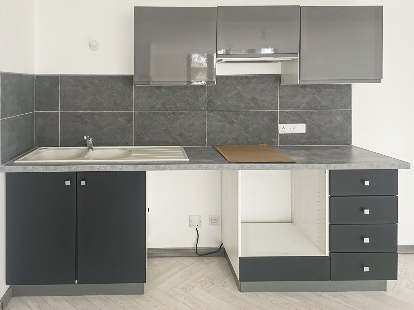 L'appartement est composé d'une pièce de vie avec une cuisine meublée et équipée (hotte et plaque de cuisson), de deux chambres et d'une salle d'eau.