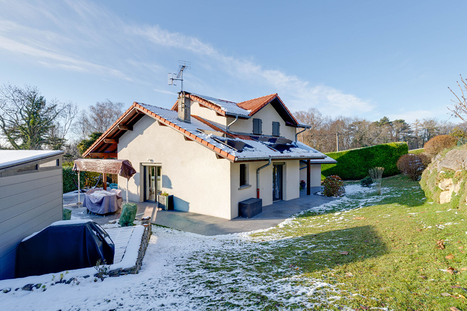 À l'extérieur, laissez-vous charmer par un magnifique terrain arboré et parfaitement entretenu de 1 000 m², une grande terrasse avec jacuzzi, parfaite pour des moments de détente, ainsi qu'un abri de jardin, un garage et plusieurs places de stationnement.