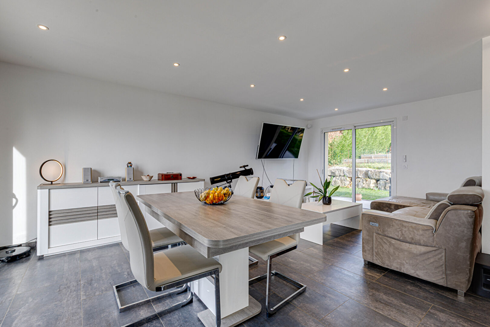 L'extérieur comporte un jardin contournant l'ensemble de la maison. Une terrasse de 100m² accueillera vos moments de convivialité.. La partie herbeuse attenante supportera les activités ludiques voulues.