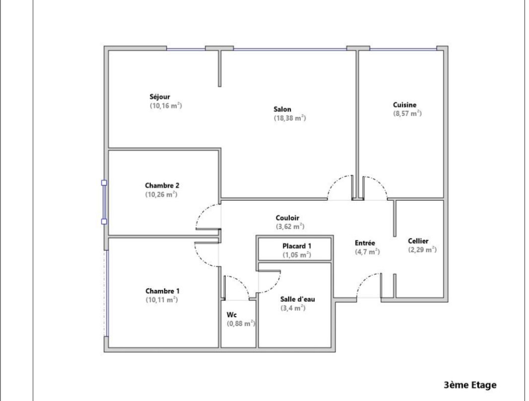 Il se compose d'une entrée avec rangements, d'une cuisine entièrement aménagée et équipée, un double séjour lumineux (3ème chambre possible), deux chambres, une salle d'eau et des WC séparés.