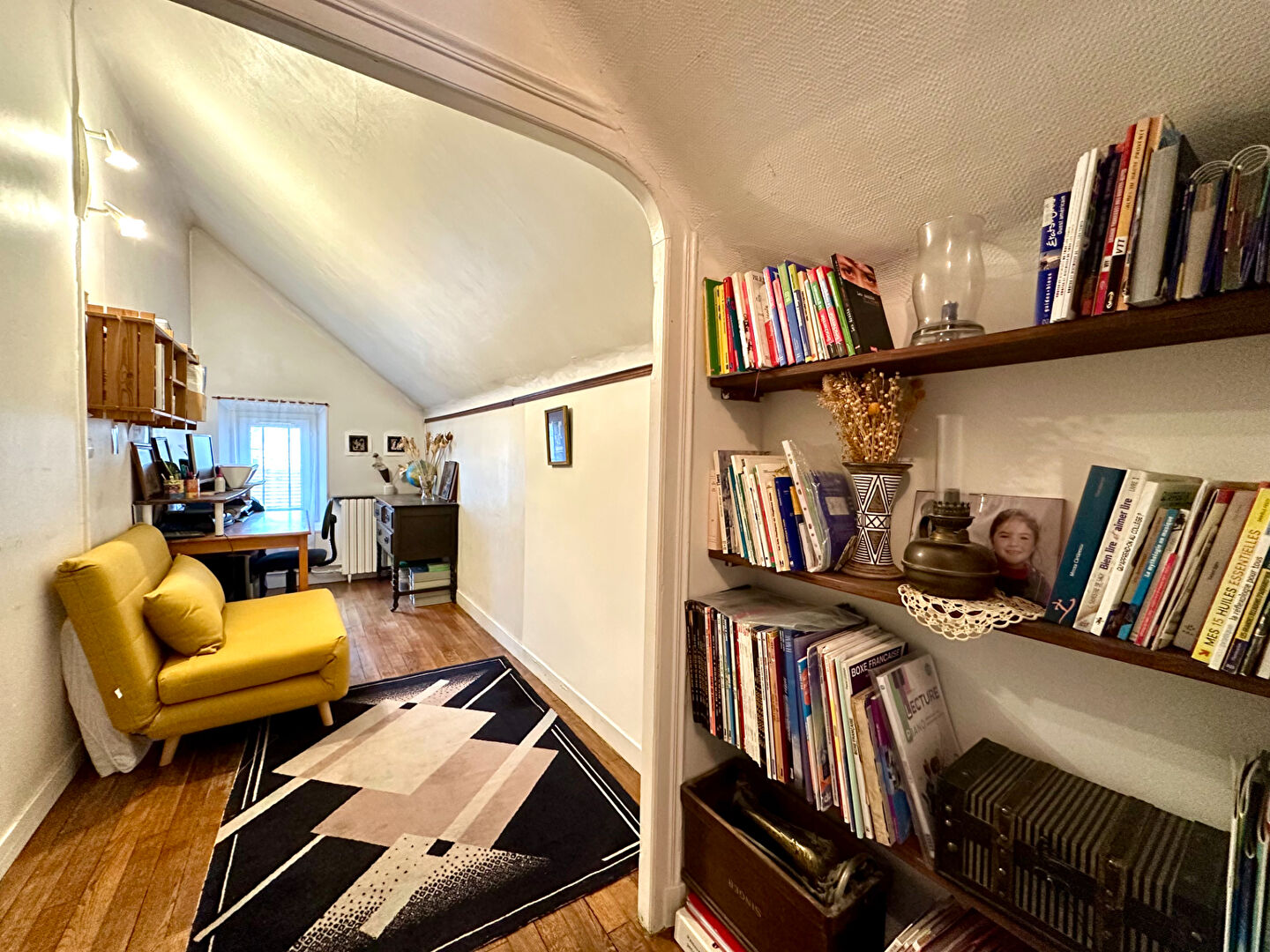 A l'étage, deux belles chambres, un WC, une salle de bain ainsi qu'un espace bureau.