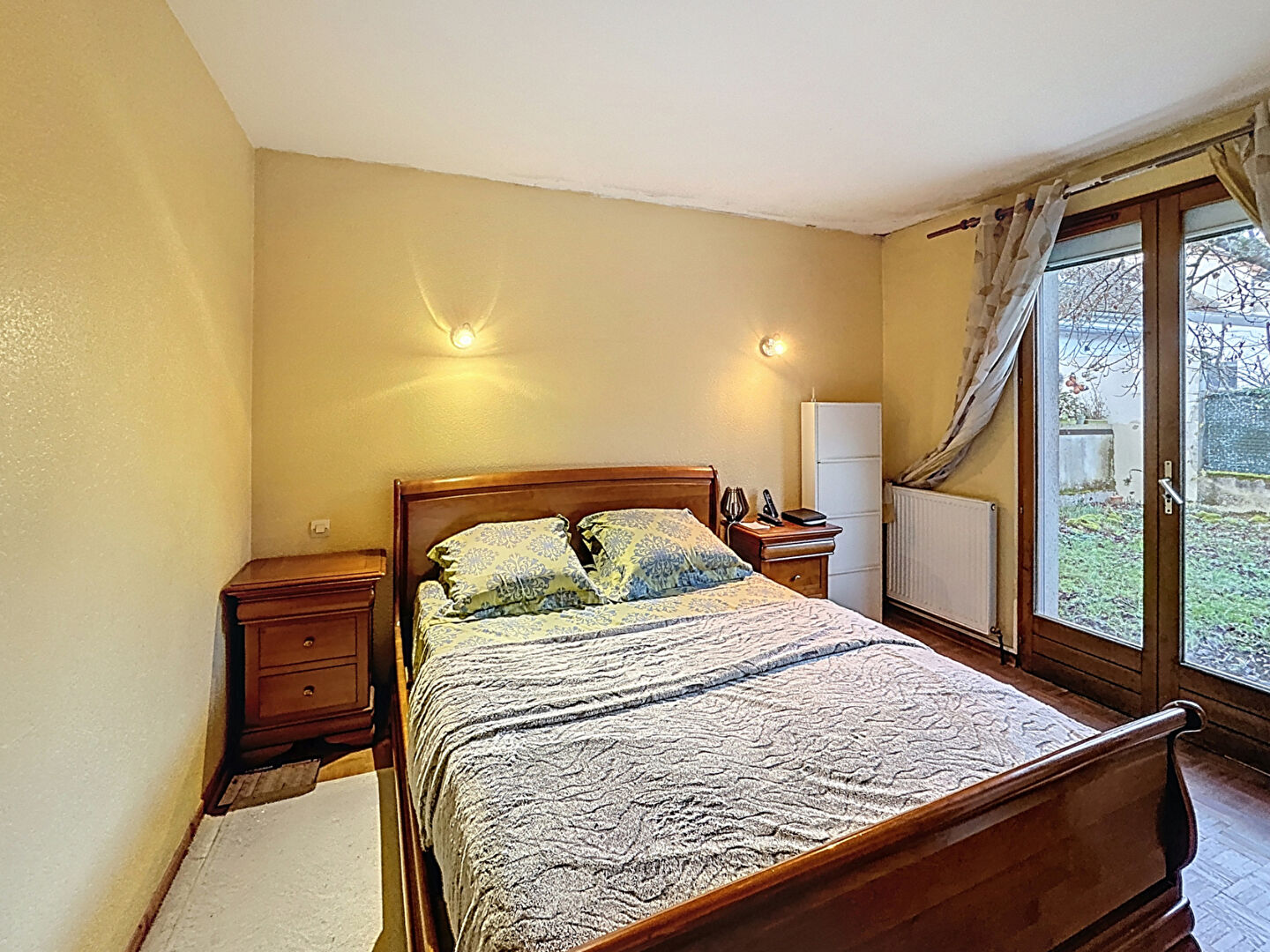 Le rez-de-chaussée propose une organisation efficace : une entrée, un salon-séjour avec cheminée, une cuisine ouvrant sur le jardin, deux chambres dont une avec dressing et une avec salle d'eau privative, une salle d'eau indépendante ainsi qu'un WC séparé. Ce niveau permet une vie de plain-pied appréciable.