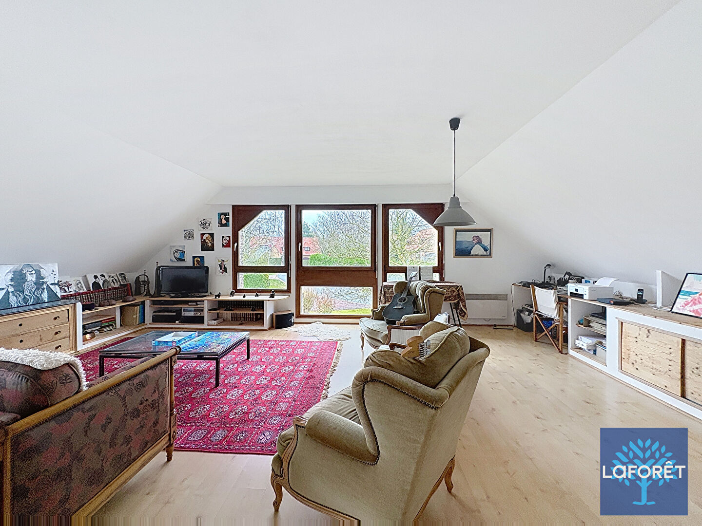 A l'étage : un palier de 13,65 m² distribue une grande salle de jeux de 32 m² (possibilité de créer des espaces modulables), un bureau pratique, trois chambres dont une suite parentale, une salle de bains et un WC.