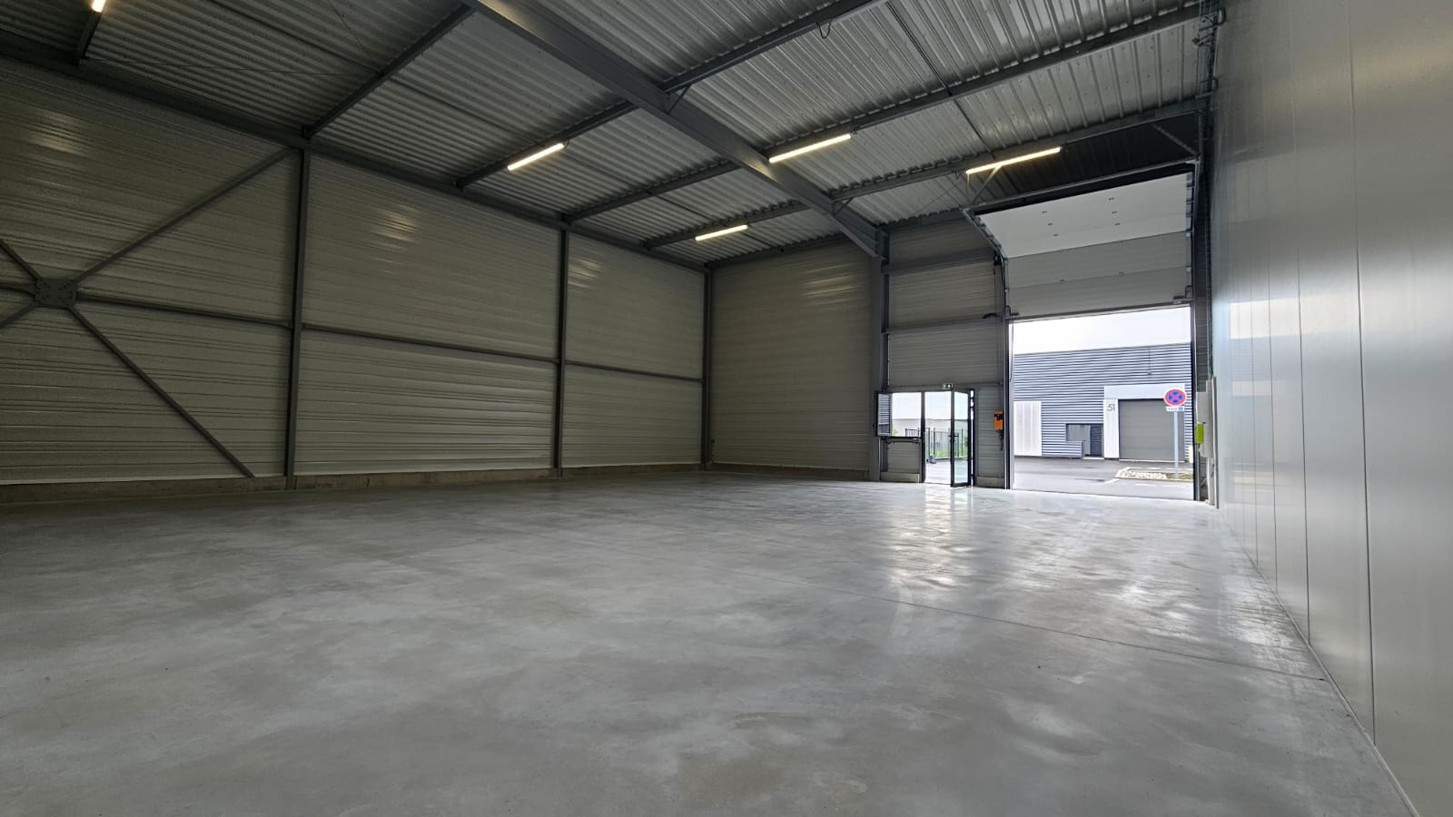 - Une porte sectionnelle de 3 x 3,5 m, une porte vitrée et une fenêtre en alu double vitrage.