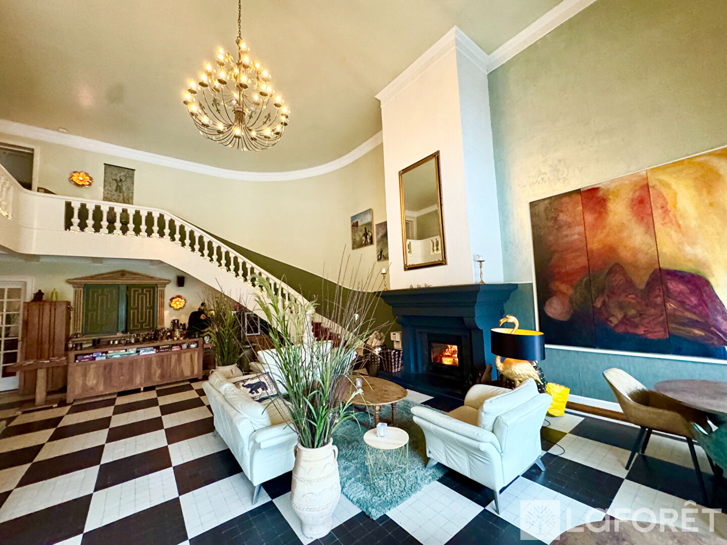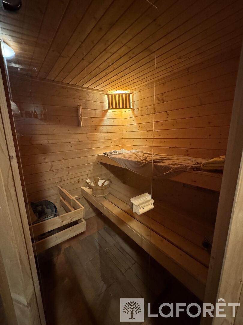 Au rez de chaussée : entrée, vaste salon de 84 m² avec un belle hauteur sous plafond, ainsi qu'un espace privatif ( un séjour, 2 chambres, chaufferie, salle d'eau, cuisine, buanderie, accès sauna).