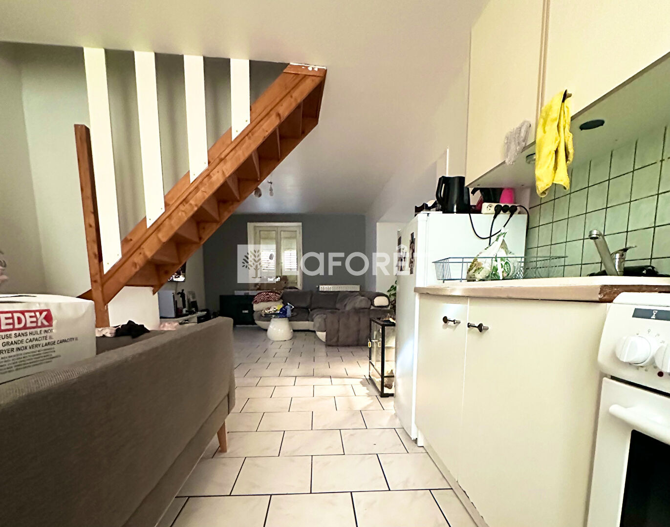 Au rez-de-chaussée : entrée ouverte sur un salon séjour et cuisine, et un WC