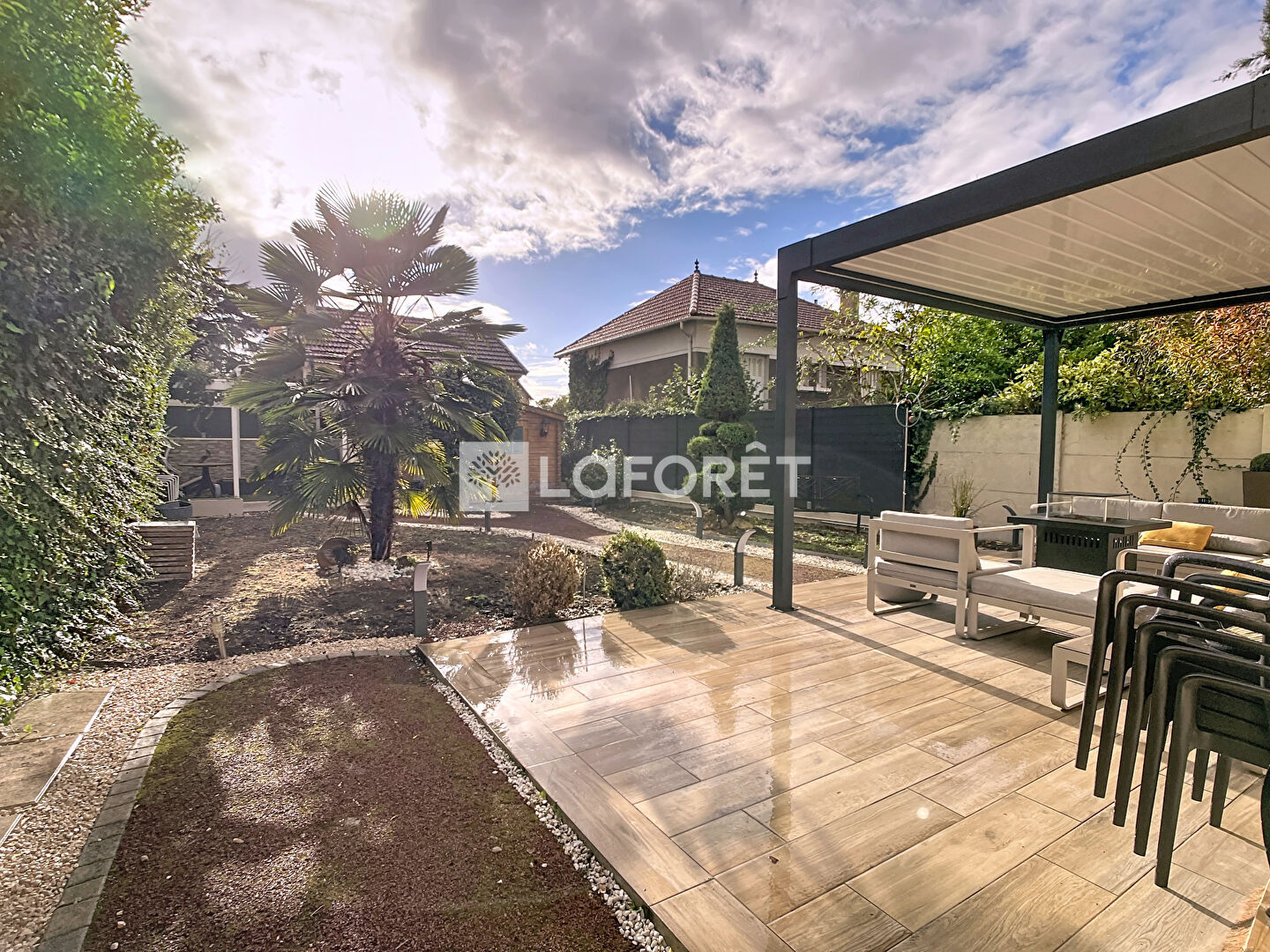 Agréable jardin bien exposé avec terrasse et pergola plus un abris de jardin en bois.